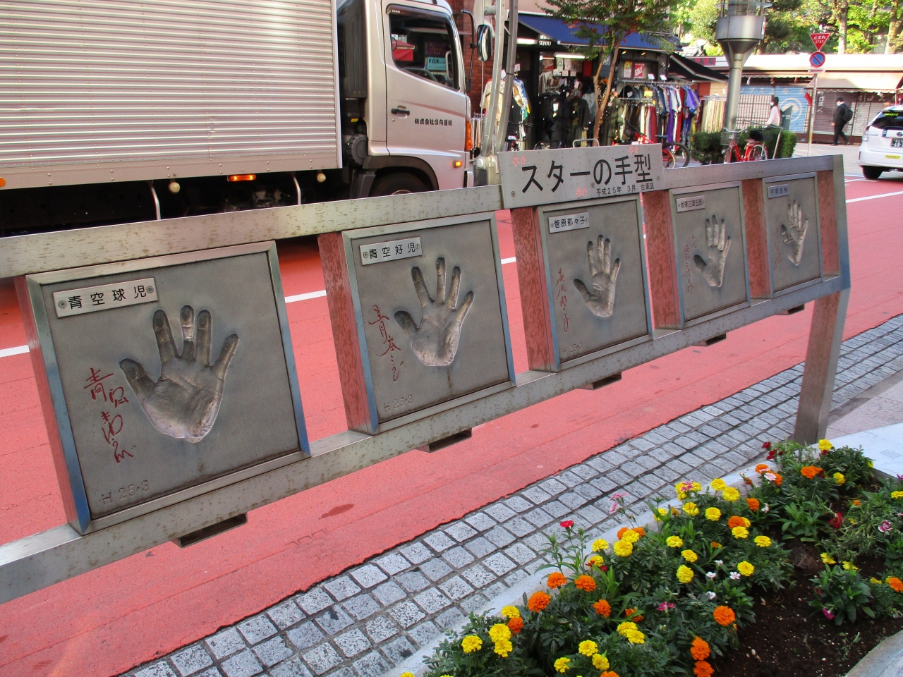 浅草のオレンジ通り沿いを散策していた時に、浅草公会堂に立ち寄りました。催し物などは行われていたかったので、やはりコロナが演劇の世界に大きな影響を及ぼしているのだろうと思いました。それでも公会堂の前には、スターの手形が何か所も設置してあったので、一人一人を眺めてとても楽しめました。