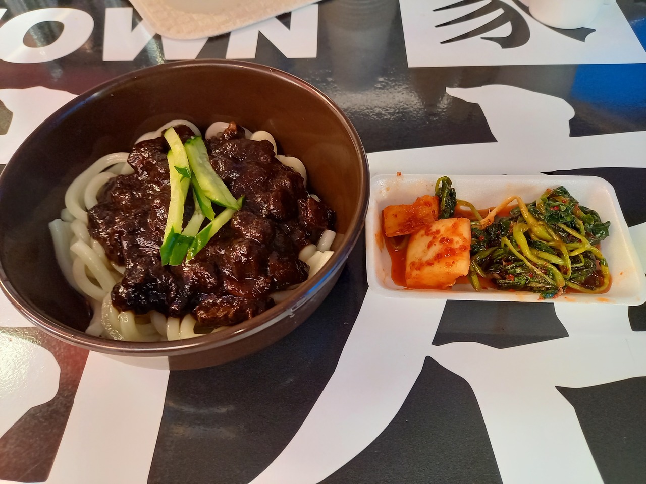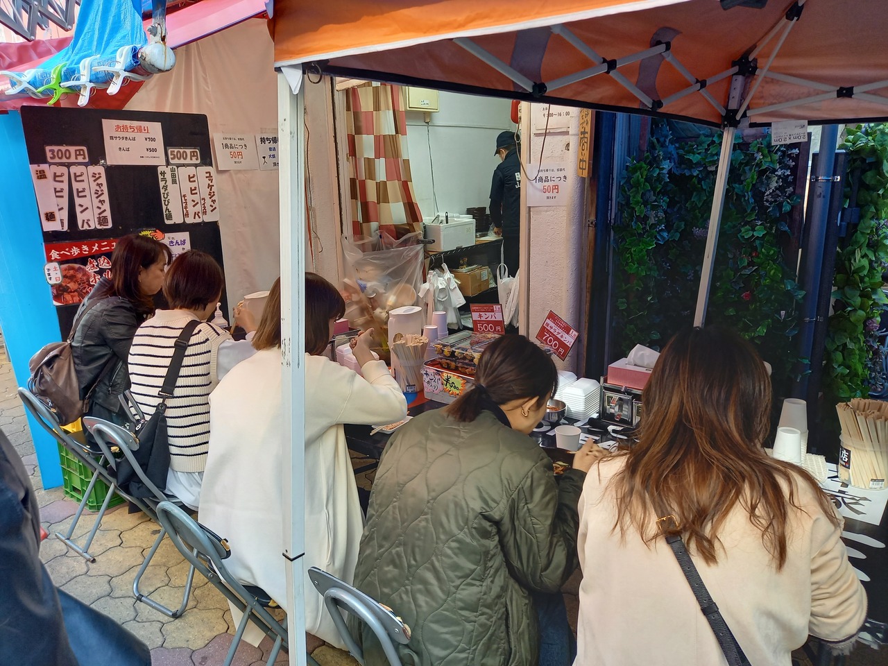 御幸通り中央と東商店街との境付近にあります。キムチの種類が半端なく行列のお店です。隣には屋台があり、量は少ないですが、300円でビビンバ、ビビン麺、ジャジャン麺、韓国風温素麺、500円でユッケジャン(ライス付)、ビビンバ(チャプチェ付)などがいただけます。その他に300円メニューにミニキンパかミニビビンバを付けた500円のセットメニューもあり人気でした。ビビン麺は出てくるのが非常に早いです。量が多くなく色々頼めるので女子率が高いです。今回はジャジャン麺300円をいただきました。黒くてドロッとしてました。ちょっと甘めで芋っぼいかたまりが入っていました。