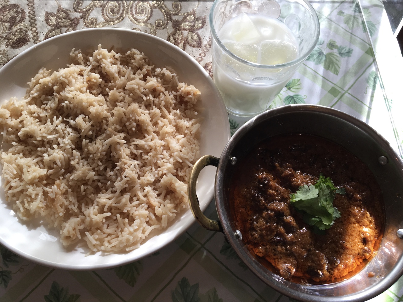 西荻窪駅南口を出て、こけし屋さんがある通りを少し歩いて路地に入るとお店の看板がありました。急な階段を登って2階の店内へ。土曜日の13時過ぎに到着したら、先客が2名いらっしゃりました。ランチのBセット(900円)で、豆のカレーとブラウンライスをオーダーしました。セットにはプレーンのラッシーと小さなサラダが付いてきました。カレーとライスは熱々でした。