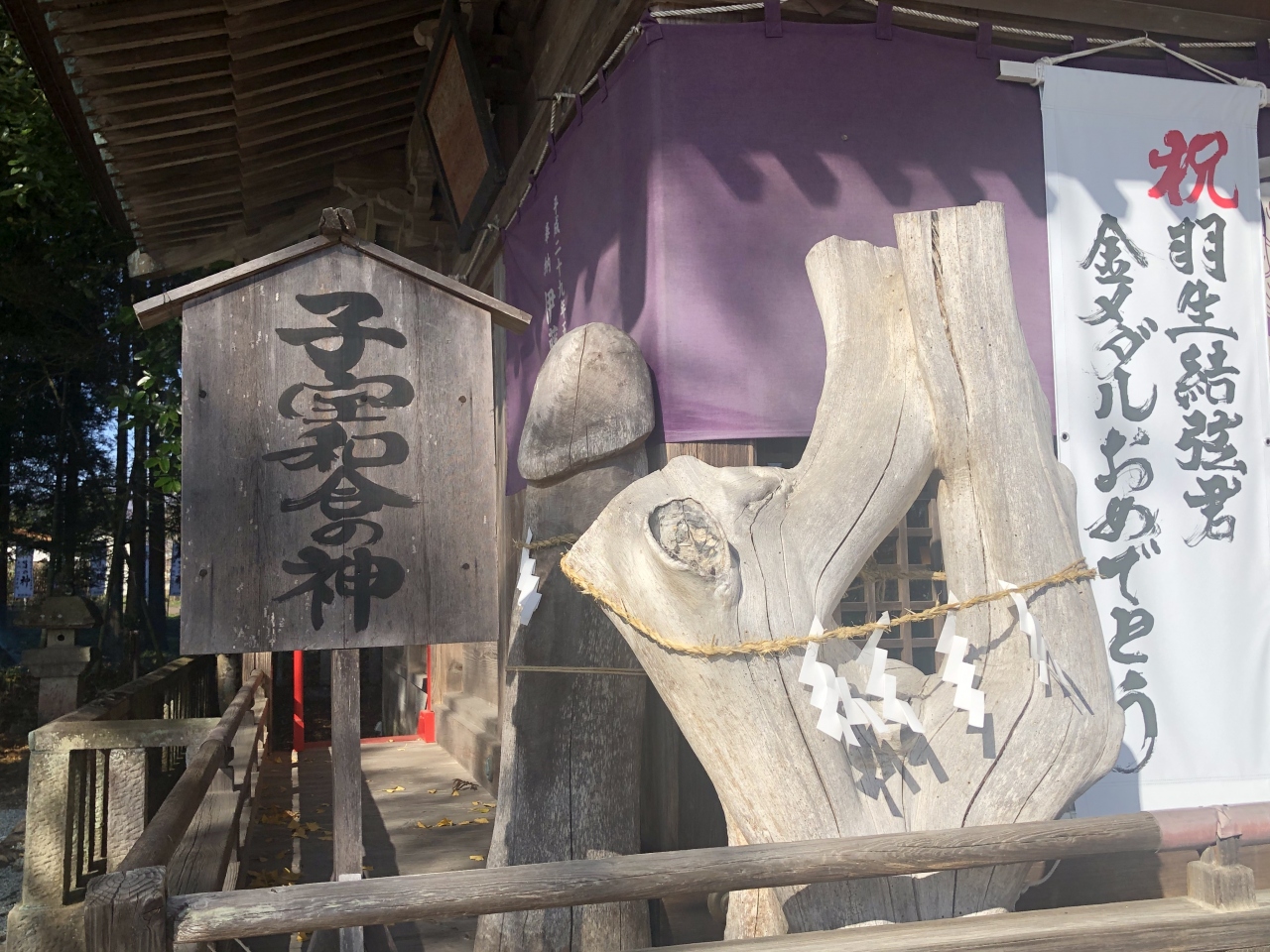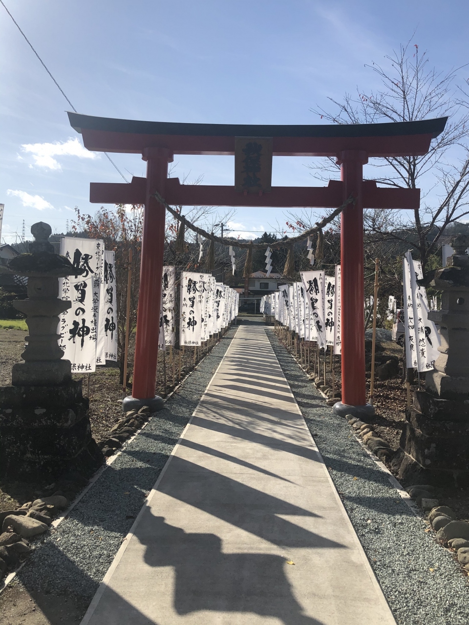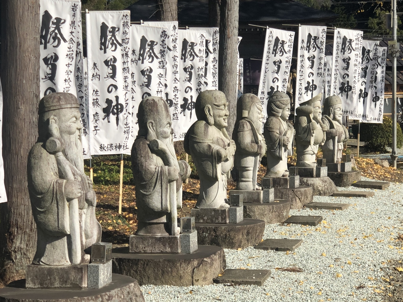 境内には「勝負の神」と書かれた白いのぼりが立ち並んでいる。平安初期の808年、坂上田村麻呂がこの地を訪れ創建、諏訪大神の御霊「戦の神」を賜り諏訪神社となり、その後明治天皇の勅命で社号を諏訪神社から秋保神社に変えた。また「子宝和合の神(縁結び)」は興味深い。また仙台出身の羽生結弦選手も参拝したそうだ。