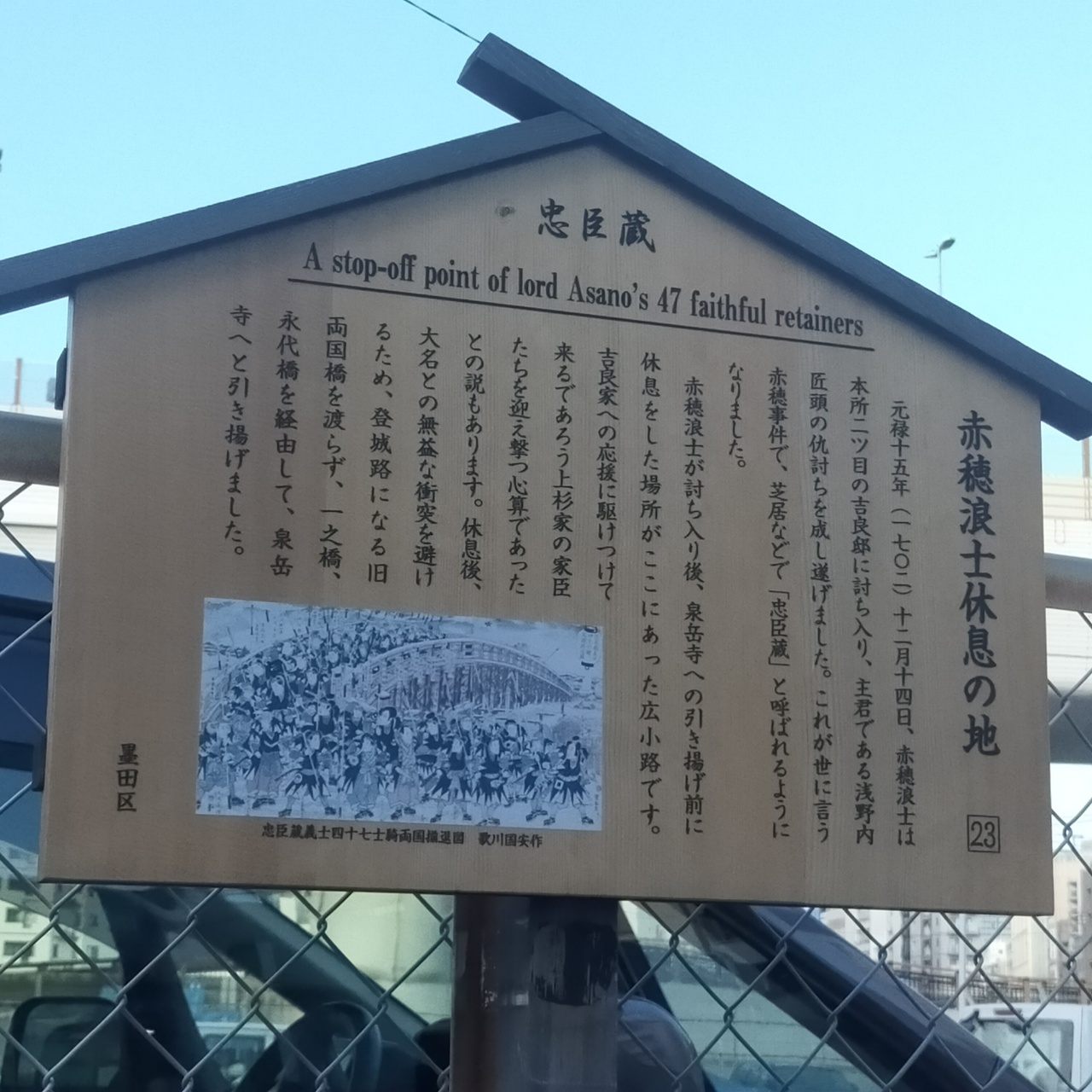 両国駅近くにある赤穂浪士の史跡です。両国には幕末の志士の史跡がいろいろあってとても楽しいです。吉良邸討ち入りの跡に、ここで休息し、泉岳寺まで戻ったそうです。300年ほど前の元禄の時代の討ち入りの歴史を現在も感じることができる貴重な場所です。