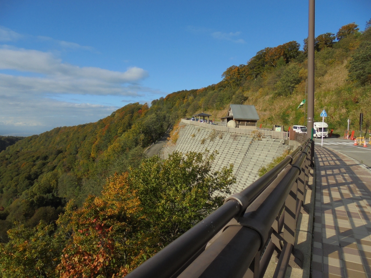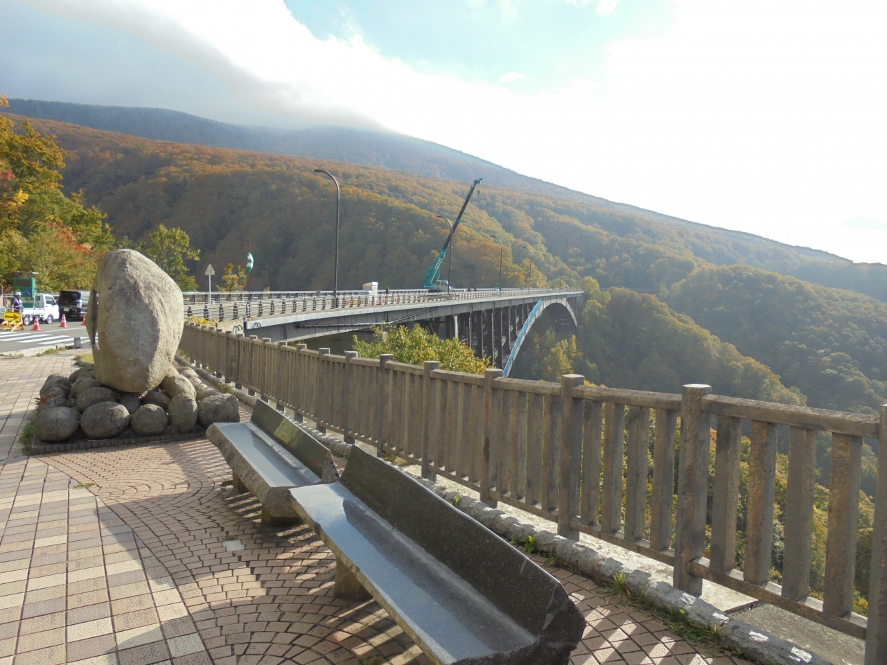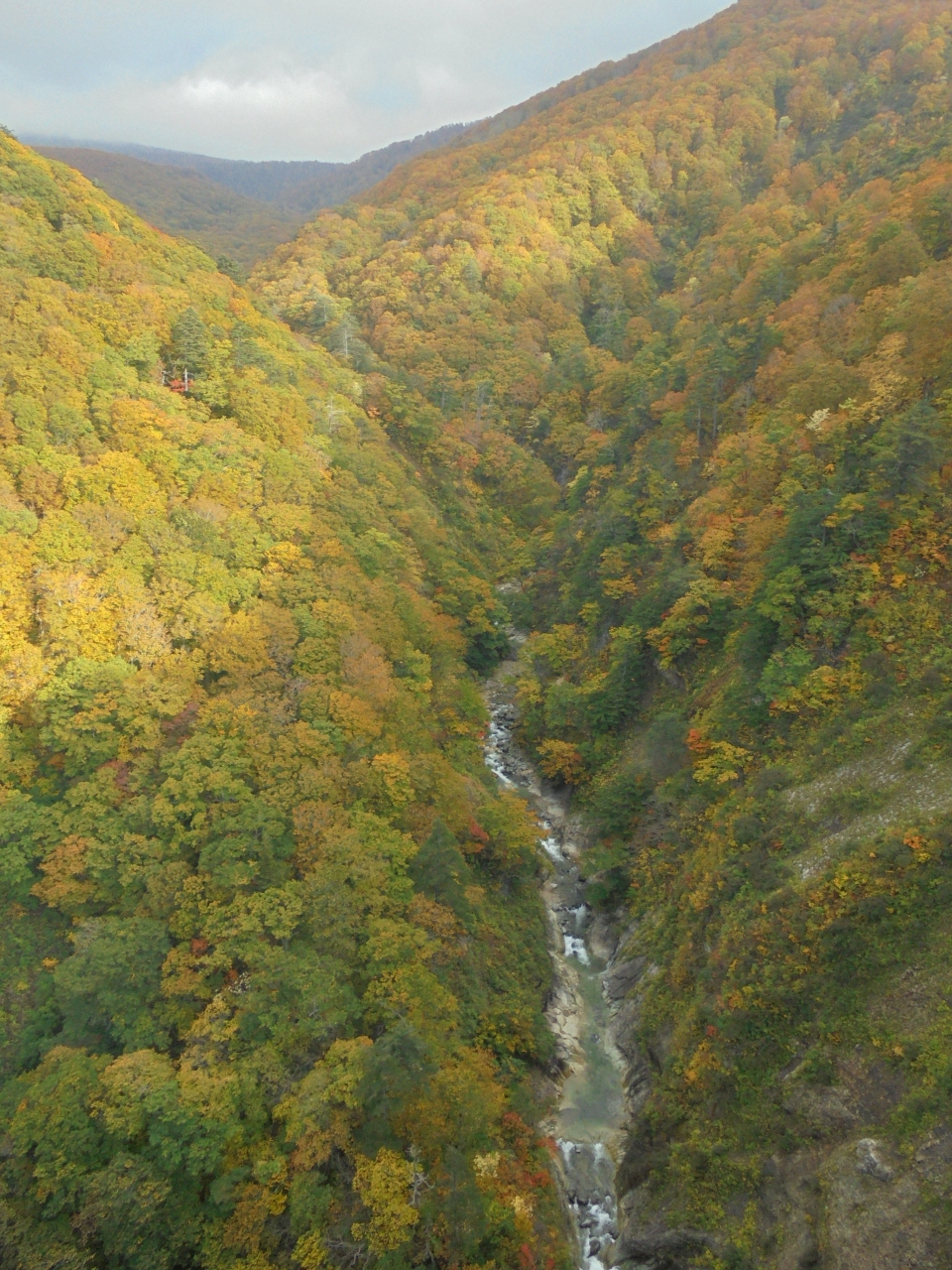 八甲田山の酸ケ湯温泉を過ぎた所にあります。訪れた当日は、橋の中途が工事中になっていました。高さ122mの橋の中央付近は風速20m以上あるような強風。隣で悲鳴が。観光客のカップルが何かを強風で吹き飛ばされたようだ。360度のパノラマは筆舌に尽くし難いほど、大迫力のスケールに圧倒されそう。まだ紅葉は始まったばかりで、緑色が多い。それでも橋のたもと付近は色づきのいい木々が生い茂り、景色を一層引き立てていた。