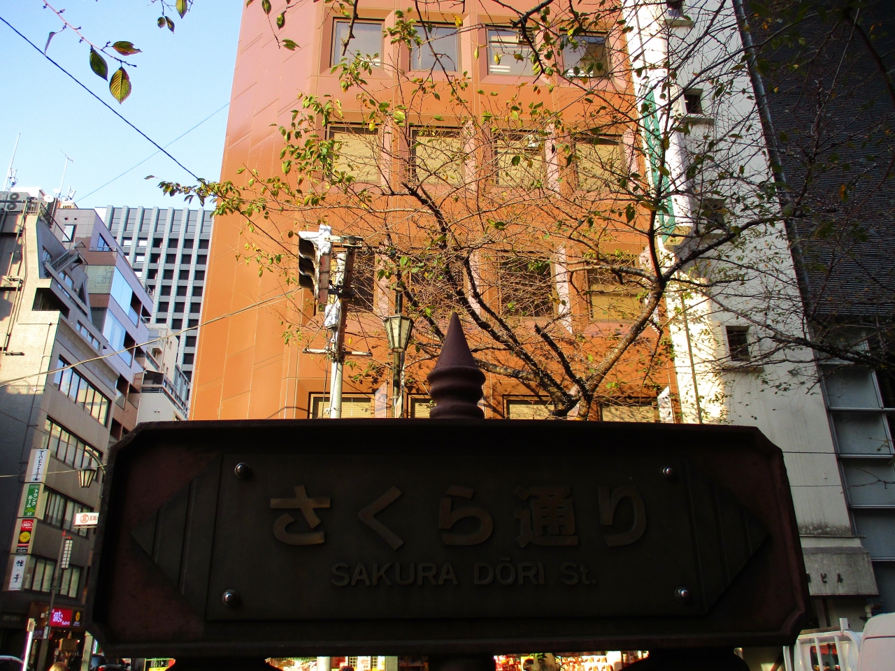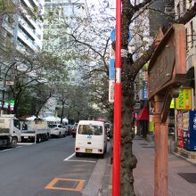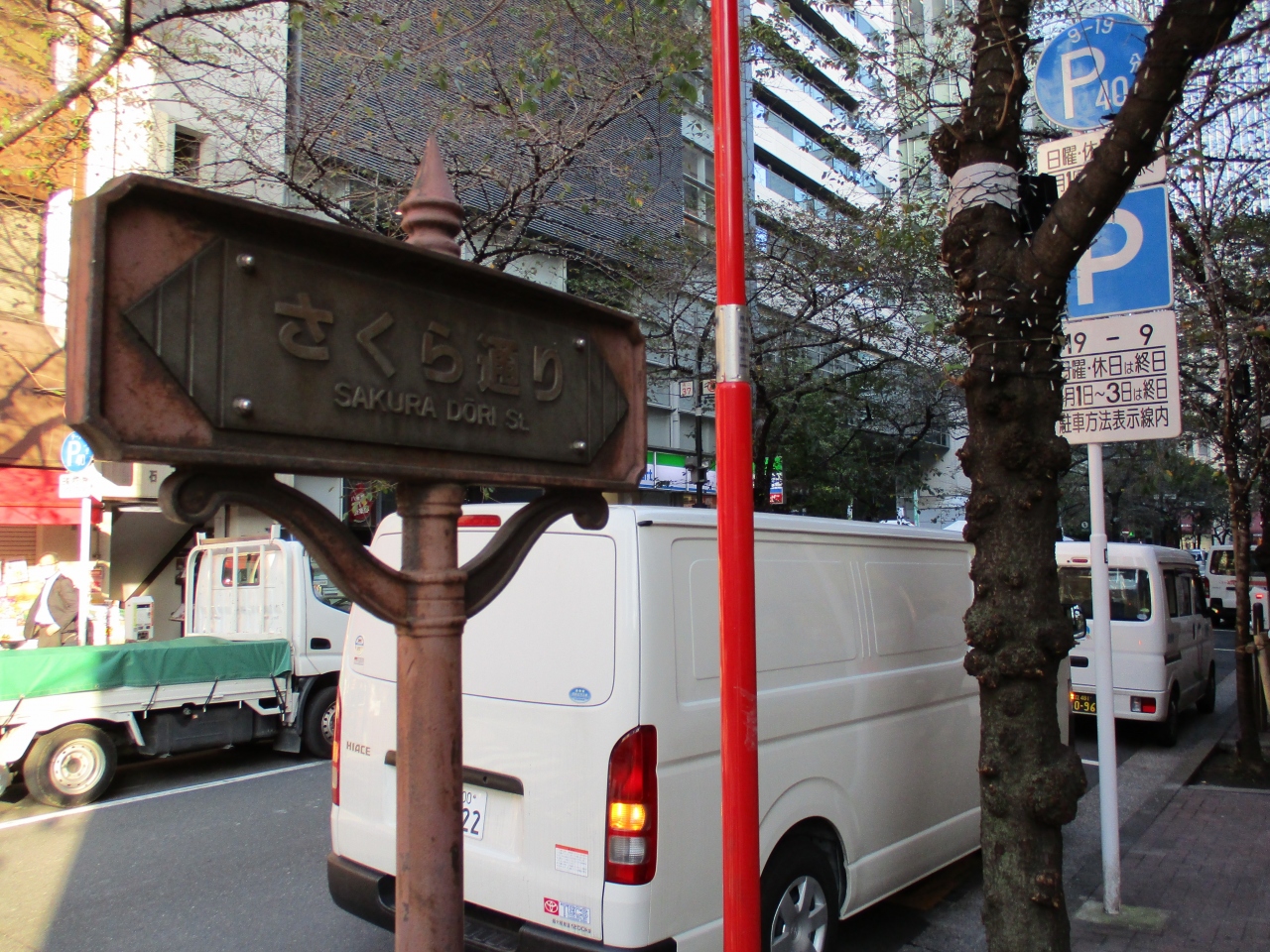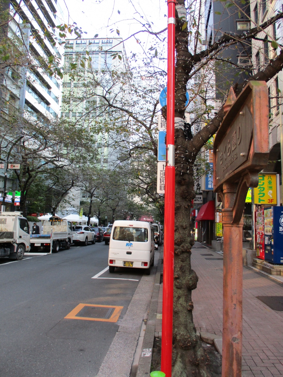 東京駅に近い八重洲近辺を散策している途中で歩いた通りです。会社勤めの人が多く歩いていました。今の時期は普通の通りですが、桜の時期には両側に植えられた桜が咲いて、街の中とは思えないとても華やかな雰囲気に包まれる通りです。春にはまだまだですが桜見物に来たいと思いました。