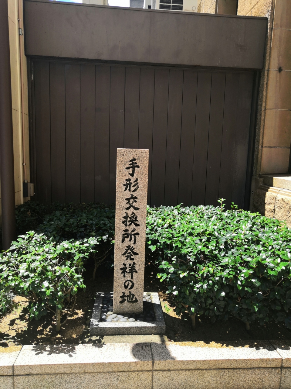 三井住友銀行大阪本店の東側の出入り口の左側の植え込みにある石碑です。読んで字のごとくではありますが、金融機関が約束手形や小切手などを持ち寄って決済交換する手形交換所が最初にあった場所です。さすがに歴史ある銀行ですね。