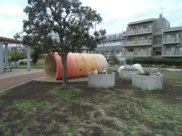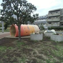 広場なので遊具などは無く、緑の中に遊歩道があるだけですが、唯一目に付くのが彩色された土管。