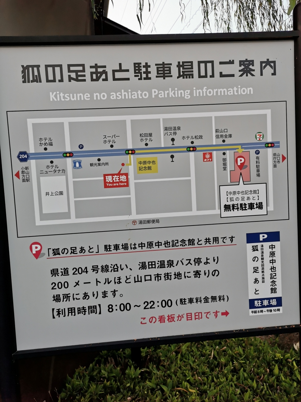 一人ドライブ旅行。山口県山口市を到着した後、某トラベルサイトで予約したのが「湯田温泉 ホテル喜良久」食事の後、ぶらぶらと湯田温泉界隈を散策しました。井上公園から少し歩くと中原中也記念館があります。「狐の足あと」はその目の前にある資料館もかねた足湯施設みたいです。どうも足湯に浸かりながらお茶を頂くことができるみたいです。残念な事にコロナ休館の時期でしたので、どれも利用が出来ませんでした。
