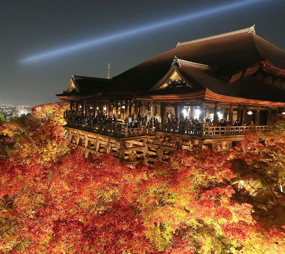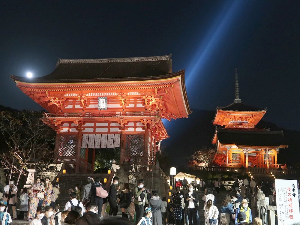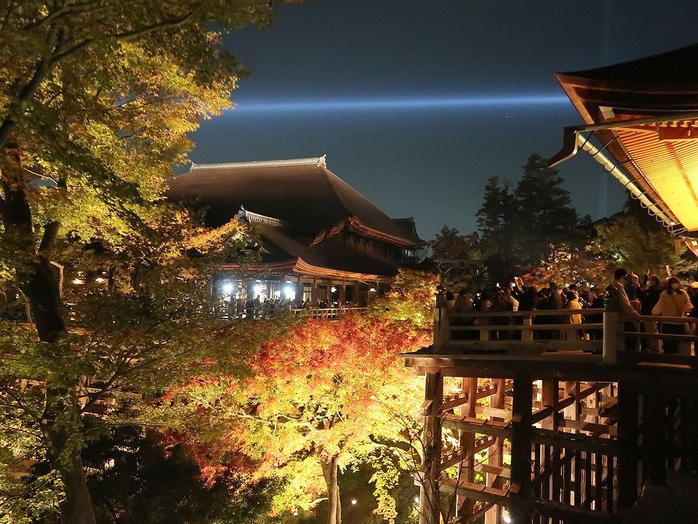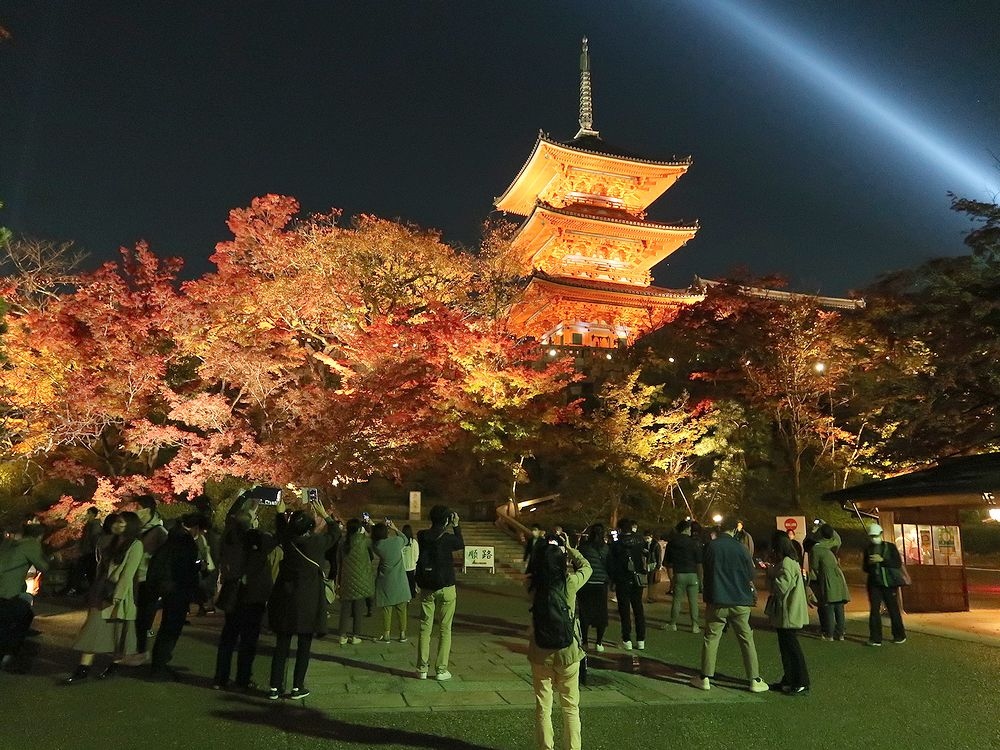 2008年に始まり、12年間にもおよぶ大改修も終えた清水寺の紅葉を見たいと思い、2021年11月18日の夜6時過ぎに訪れました。仁王門付近、清水の舞台上、舞台の向かい側などの撮影スポットは、どこもライトアップの撮影をする人たちですごく混んでいました。平日でもこれだけ混んでいたので、休日の混み方はもっと密になるだろうと想像できました。コロナ禍以前に戻ったような混み方だったので、これから行かれる方は休日は避けた方がよさそうです。紅葉は見ごろを迎えている木もあれば、まだ早いところもありピークはまだ先のようにも思えました。