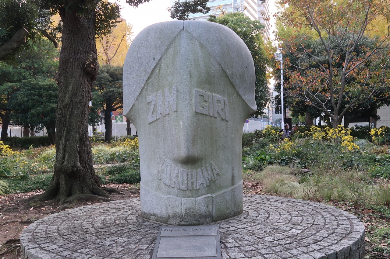 遠くからみると、あれ鼻か?モアイ像か?という感じですが、近づいてみると、目の部分にローマ字でZANGIRIとあり、口にはYOKOHAMAでにっこり。さっぱり散切りにして、「ザンギリ頭をたたいてみれば、文明開化の音がする」と口ずさんでいました。