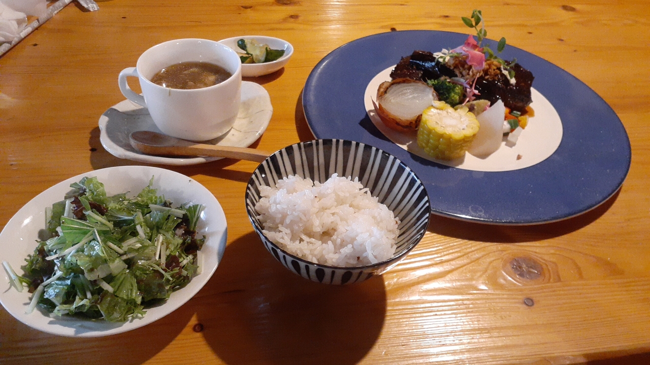 えぞ鹿肉の他、ご飯・サラダ・スープ・お新香・ソフトドリンク、さらに付け合わせとしてコーン・玉ねぎ等がつき、内容は充実していました。