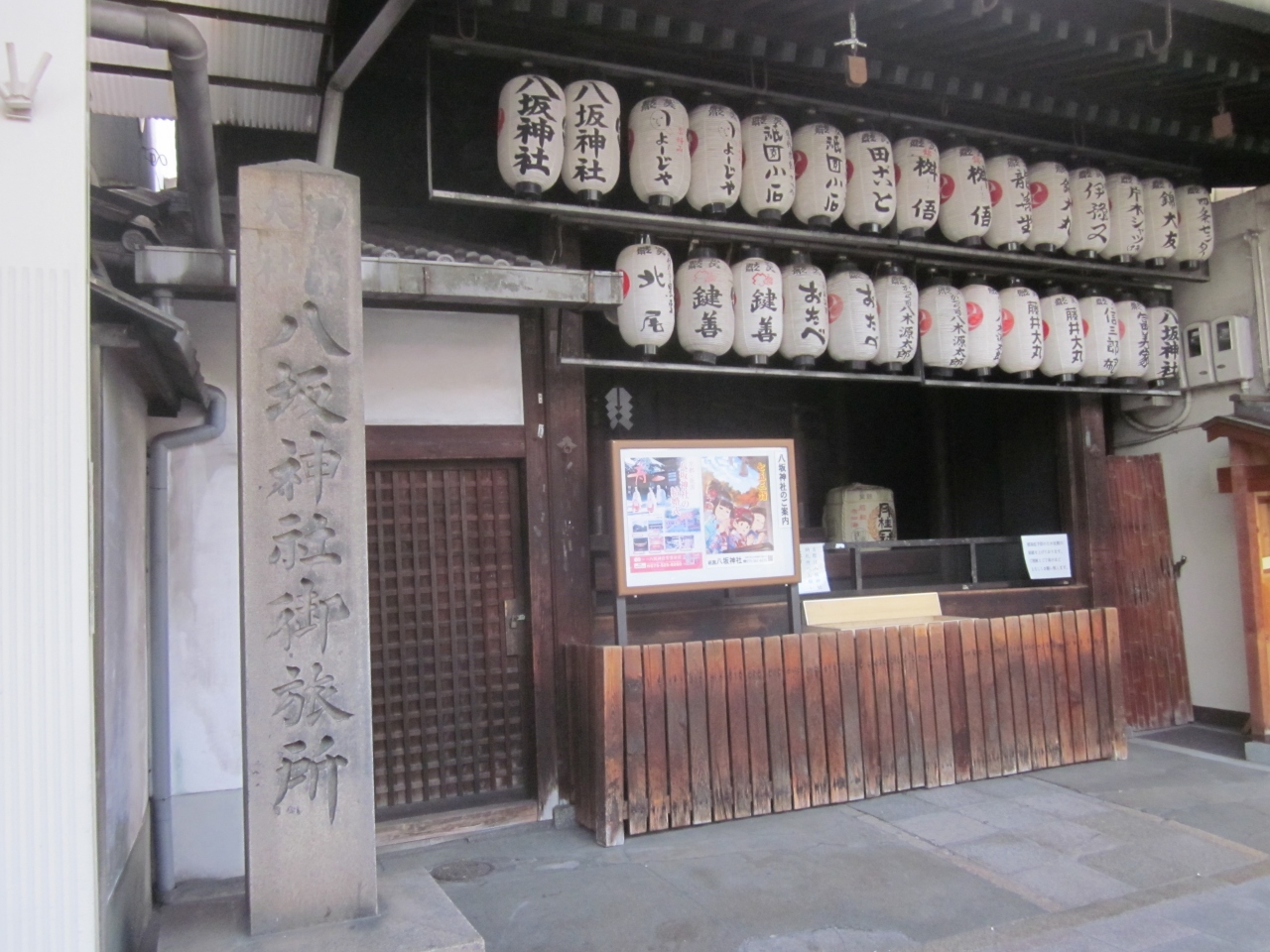 八坂神社御旅所は、四条通りを歩いていた時に見ました。たくさんの提灯が印象的でした。八坂神社と関係があるようで、出張所のような感じでしょうか。夜にも前を通りましたが、夜は提灯のライトアップがキレイでした。
