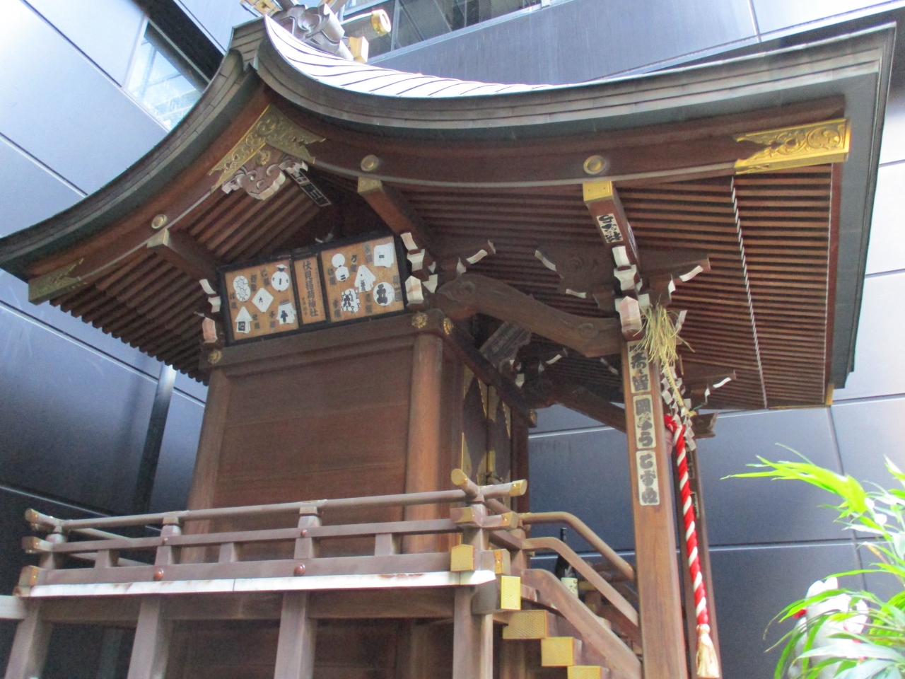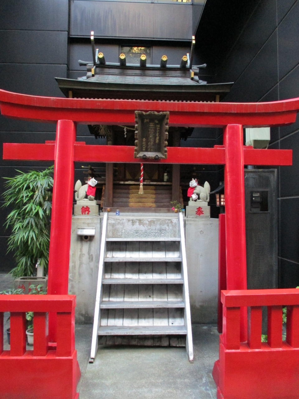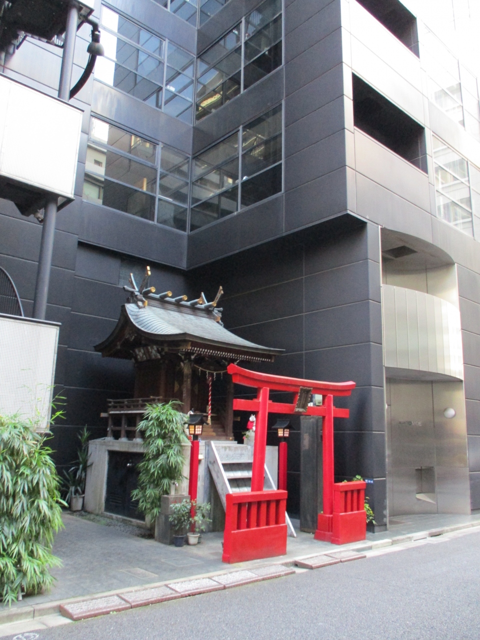 八重洲近辺を散策していた時に、ビルとビルに挟まれたわずかな場所に、あざやかな赤い鳥居が見えたので立ち寄ってみました。鳥居の扁額には伏見稲荷と書かれていましたが、由来書きなど見当たりませんでした。都会のほんとうに小さな稲荷神社でした。
