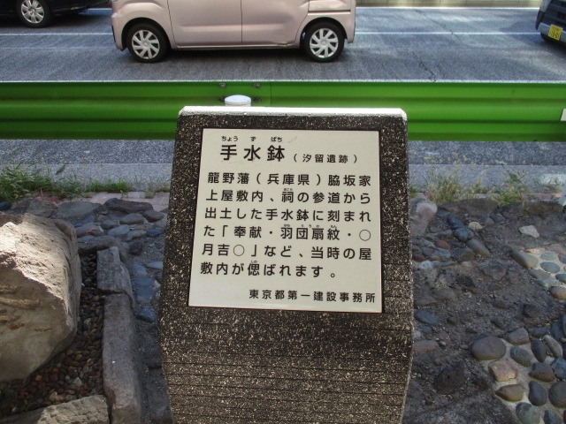 JR新橋駅から銀座7丁目の花椿通りと昭和通りが交差する昭和通り銀座歩道橋ときめき橋の階段下の中央通り寄りにある手水鉢に歩いて10分ぐらいで着きました。手水鉢は汐留再開発発掘調査時に江戸時代大名龍野藩(兵庫県)脇坂家上屋敷の祠の参道から出土した手水鉢です。歴史あるものを歩道橋下に展示するのは如何なものかと思います。歴史的に価値があるものなら展示方法を考えて欲しいと思いました。