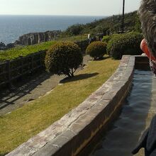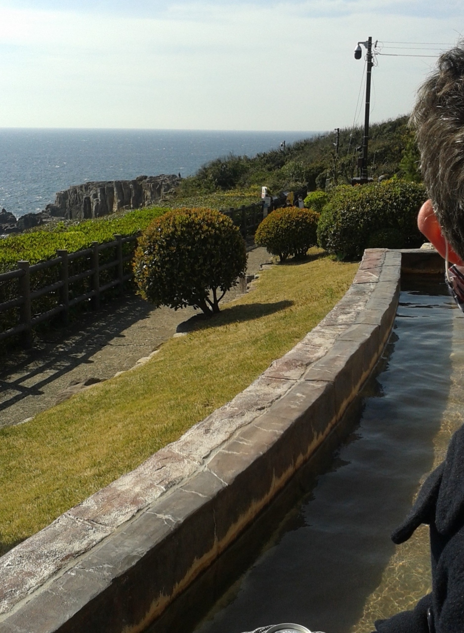 三段壁のすぐ近くにある足湯です。お土産屋さんと洞窟に入場する建物のすぐ手前にあります。ややぬる過ぎてすぐに出てしまいました。あと外なので仕方ないですが葉っぱなども浮いていました。海に向かっているので眺めは最高でした。