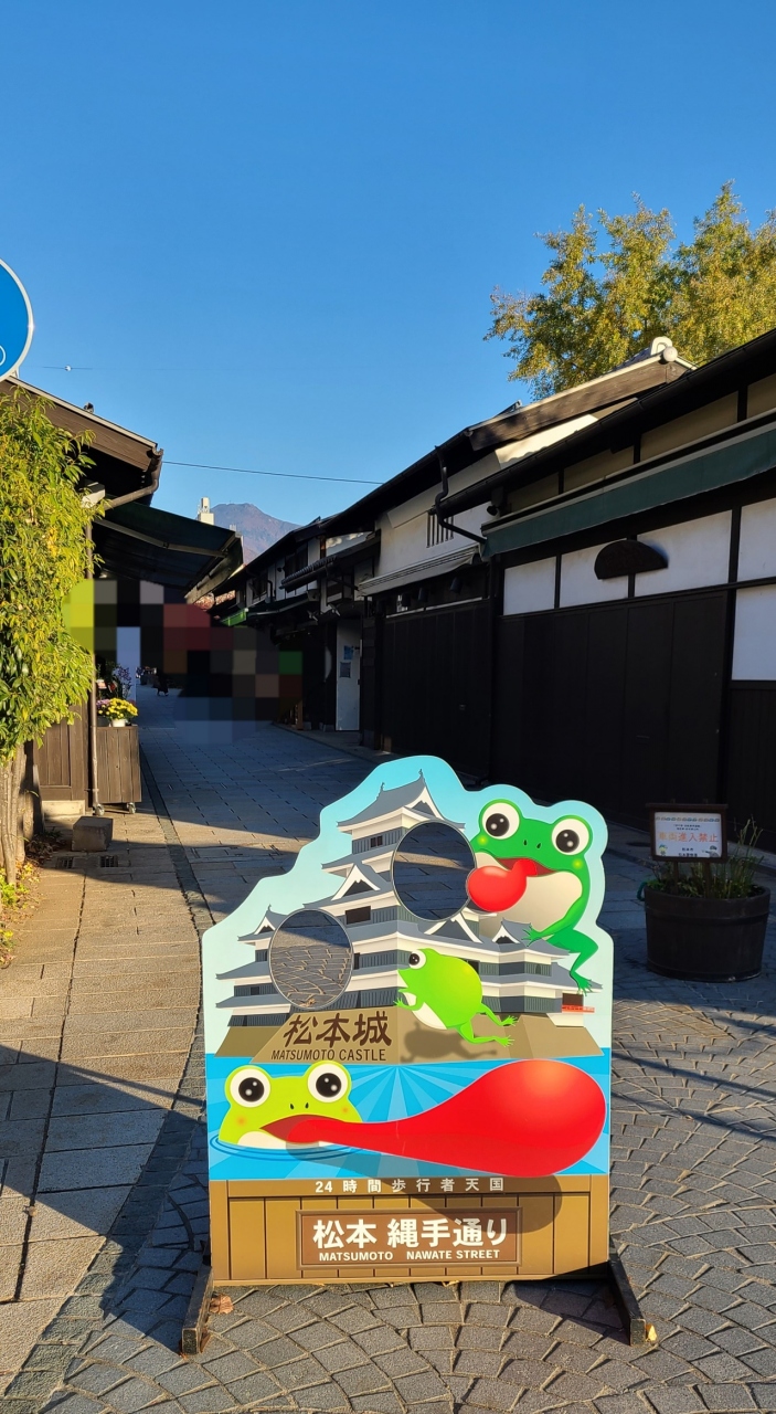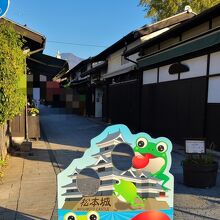 松本駅お城口から歩いて8分くらい、松本城へいく(本町通り)途中、素敵な橋を渡ったすぐ右側から始まります、大きな蛙侍が目印です。