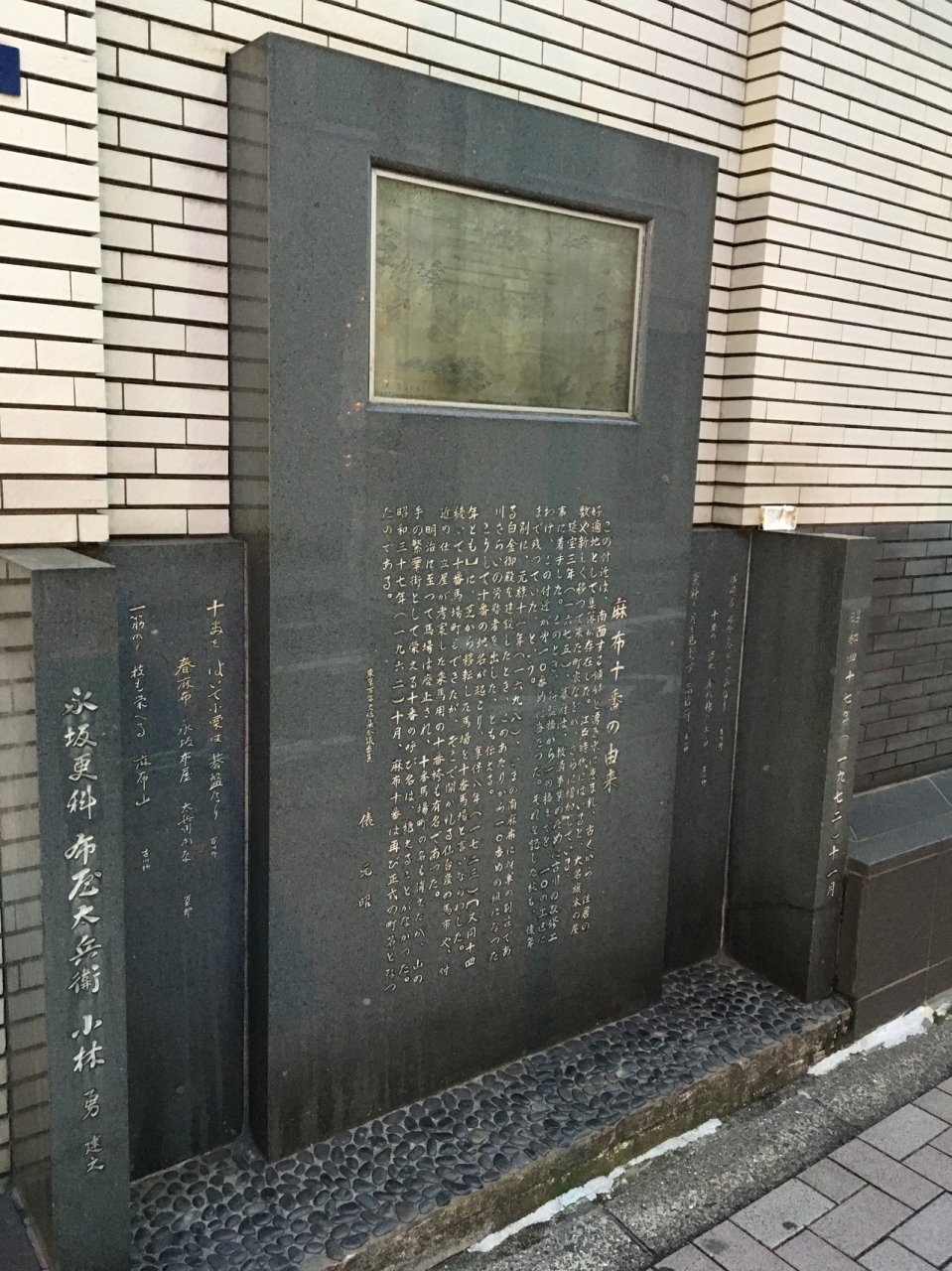 麻布十番商店街を歩いていた際に、有名な蕎麦屋さん、総本家永坂更科布屋太兵衛のお店の入口横に、麻布十番の由来の碑を見つけました。大きな石碑なのでとても目立ちます。石碑によると、江戸時代に古川の改修工事をした際に、このエリアが10番目の工区だったことが由来だそうです
