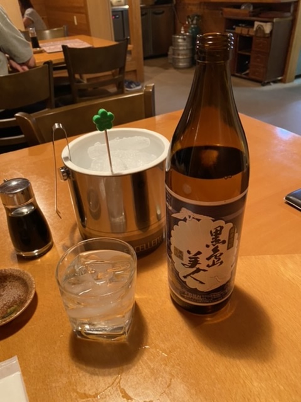 先ずは生ビール!肴は刺身。アカハタとシーラでした。そして芋焼酎黒島美人はボトルで。次の肴は沖縄県部隊塩焼き。〆は刺身で食べたアカハタのあら汁。