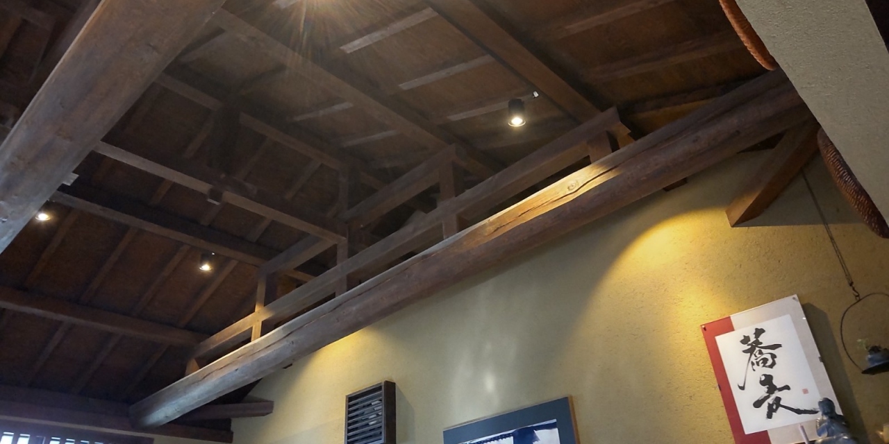 古民家をリノベした落ち着いた佇まいの外観、店内も天井のない梁剥き出しで解放感がある。