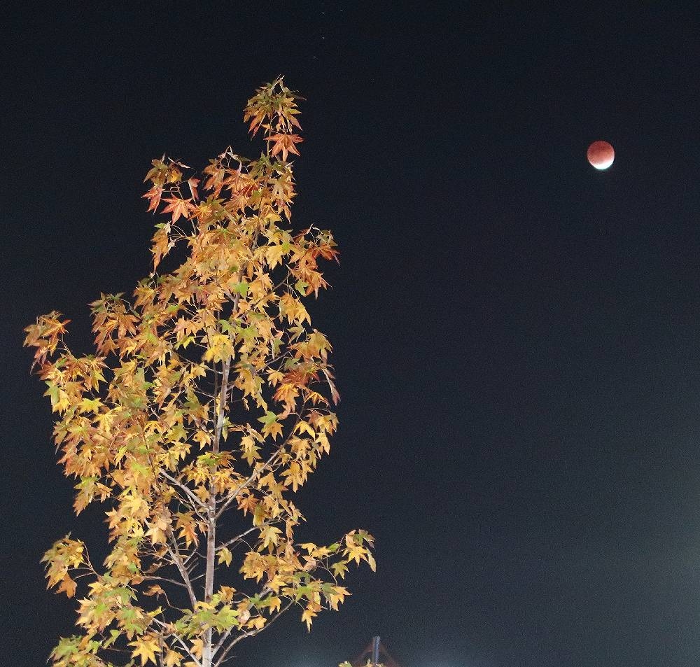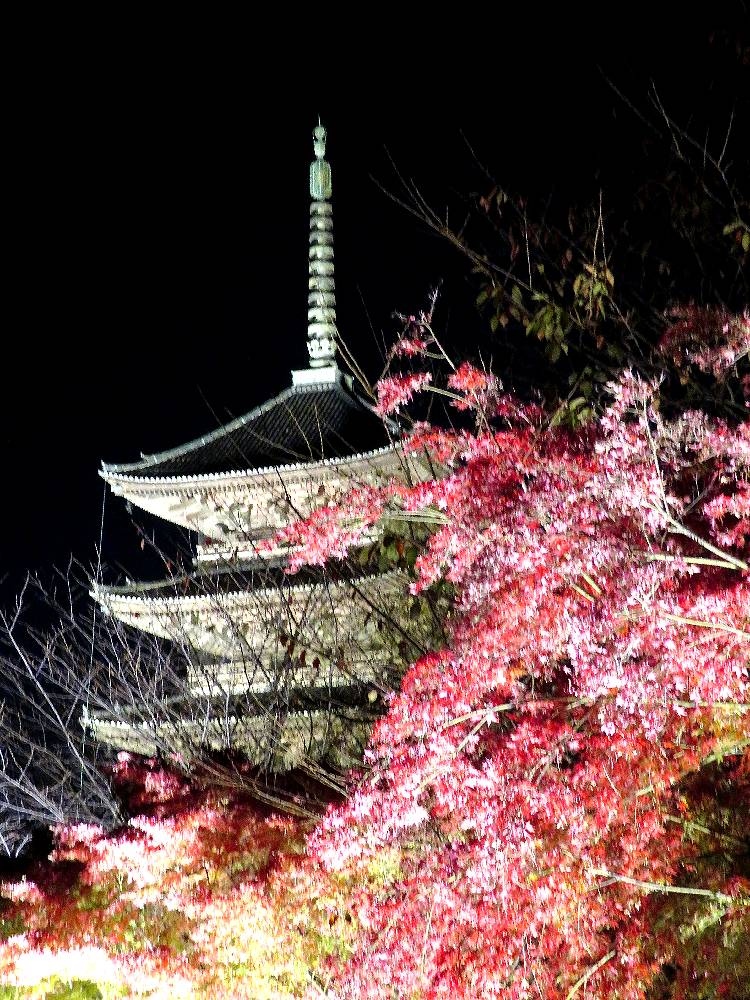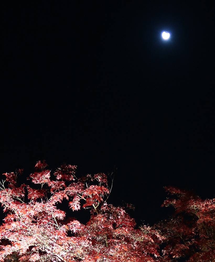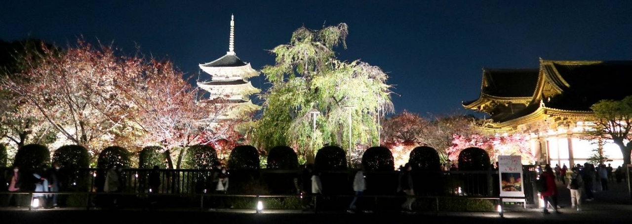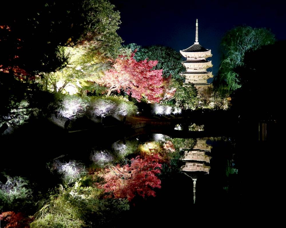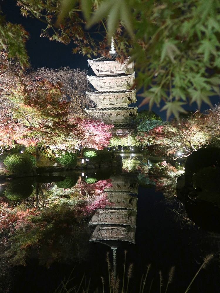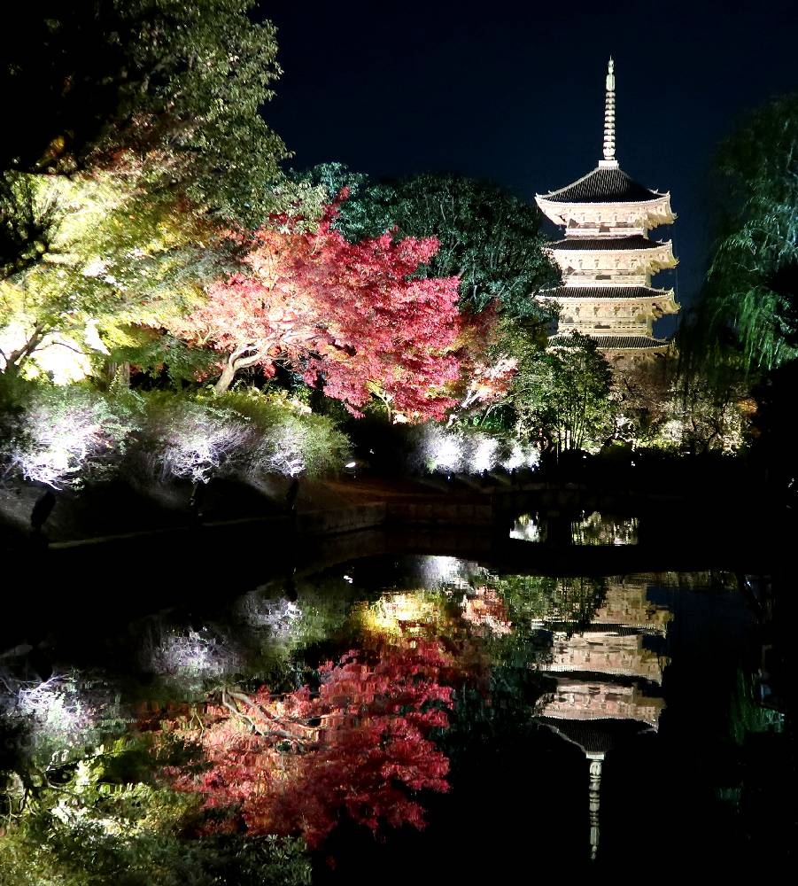 11月19日金曜日の夜7時少し前に訪れました。ちょうど皆既月食の日で月食と東寺のライトアップを同時に鑑賞できました。ちょうど紅葉も見ごろを迎え、よく晴れた風もない日だったので池に映る五重塔と真っ赤な紅葉のリフレクションをきれいに撮影できました。1時間ほどライトアップを楽しんで、帰るころには欠けていた月がもとの形に戻っていました。金曜の夜ということもあって、訪れた人が多く、撮影スポットでの場所の確保には苦労しました。平日の空いている時間帯を狙って、訪れることをお勧めします。