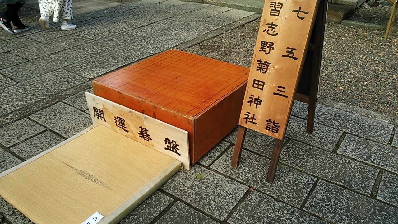 11月の七五三の時期の休日ということで小さな境内は親子連れで結構賑わっていて、祈祷のための待合所が作られてたり、碁盤から飛び降りることで子供たちの自立や開運のご利益がある「開運碁盤」があったりと色々見どころがありました。
