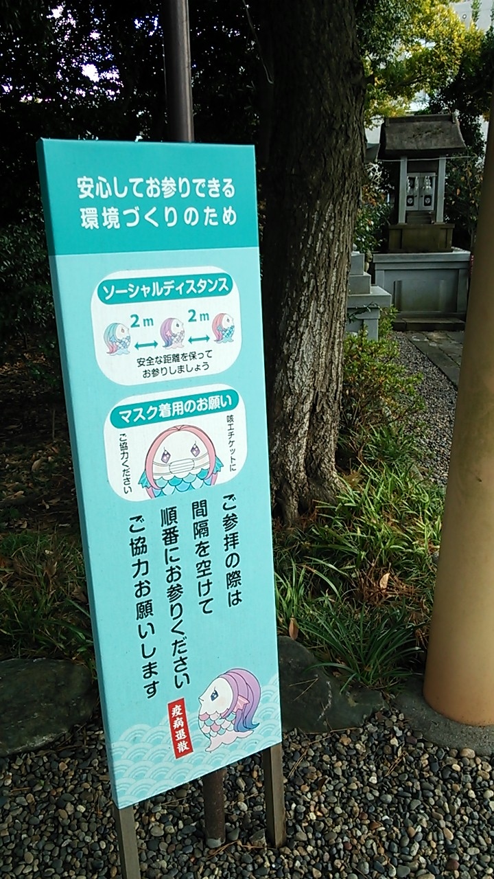 (コロナが落ち着いたとはいえ引き続き警戒する看板もあり、参拝時のソーシャルディスタンスなどをアマビエが呼びかけていました)