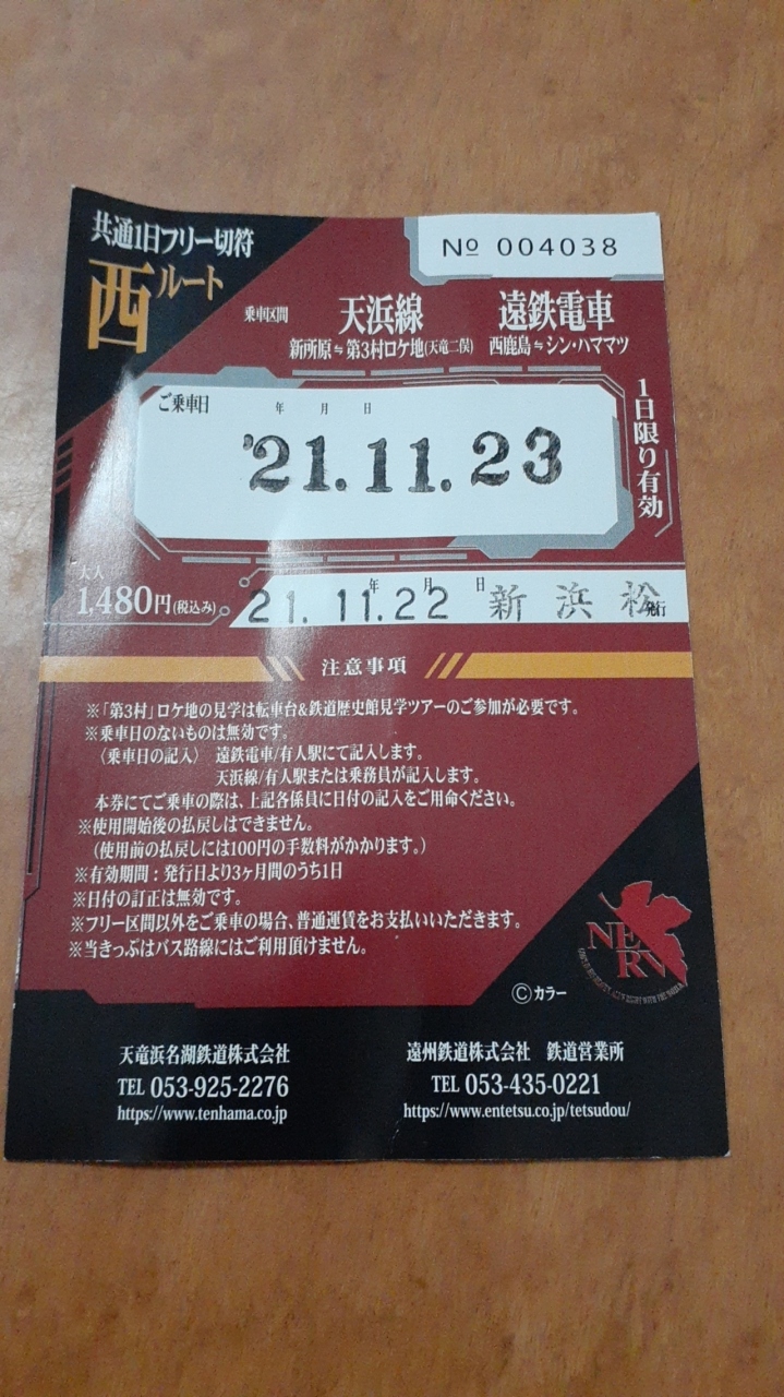 2021年11月22日にこの切符を購入しましたが、天竜二俣駅がアニメ「エヴァンゲリオン」のロケ地になったことから2021年11月22日現在、エヴァンゲリオンデザインの「共通1日フリーきっぷ」が発売されていました。