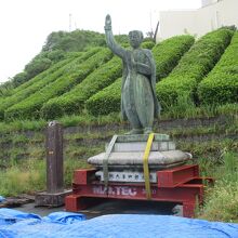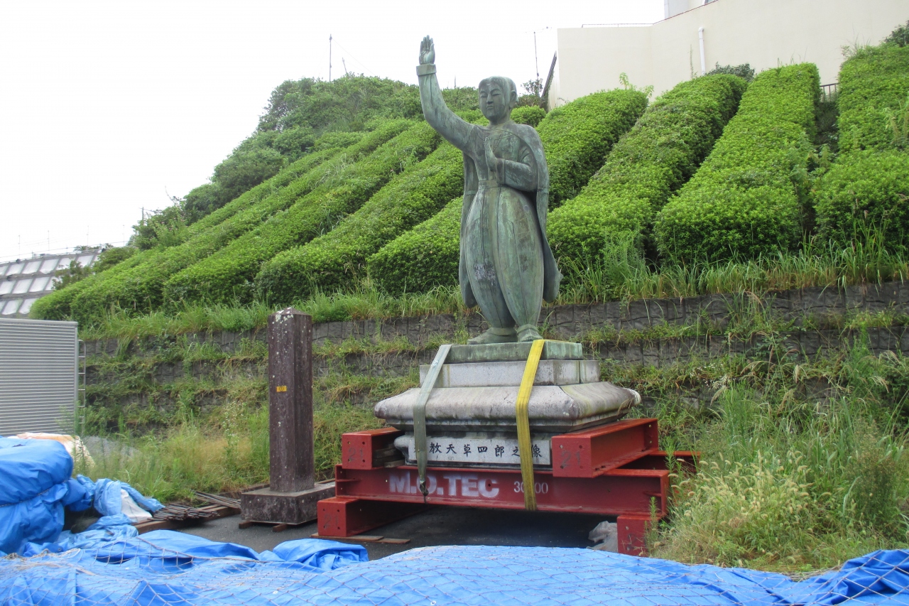 殉教天草四郎之像は、本来は丘の上にあるそうですが、ただ今大規模工事中のため、丘下の工事現地事務所横に仮置きされていました。工事用のガッチリとした鉄材の上にベルトで固定されていると、切支丹禁制の世の中で、拘束されてしまった様にも思えてしまいました。早く、開放してあげたいものです。