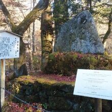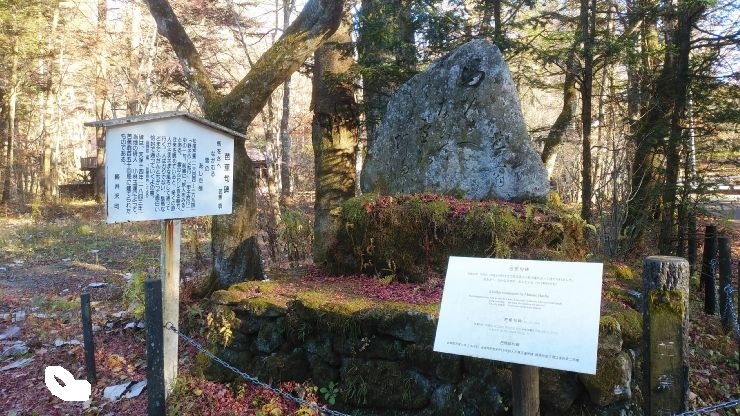 旧軽井沢のショー記念礼拝堂近くにある石碑。商店街を過ぎ、木々が生い茂る交差点の一角に置かれている。