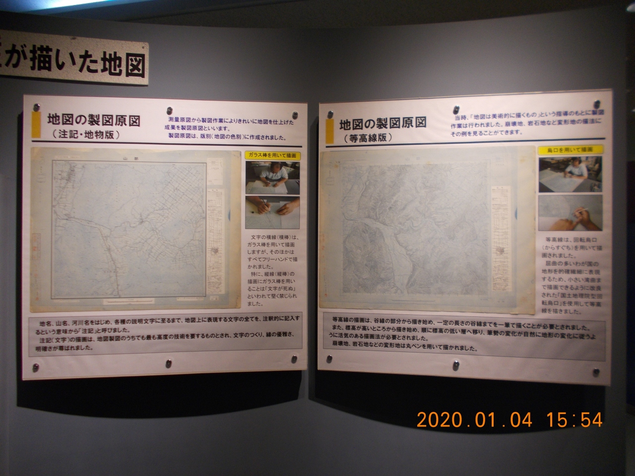 地図の作り方が解説されている。航空写真を撮り、それを基に綺麗に製図されていく。製図原図にも、土地利用の様子が分かるものや、等高線を主として地形が分かるものなど種類が分かれていることが解説されていた。実際に製図原図を作成する際の道具も製図の種類により変わることも説明されていた。