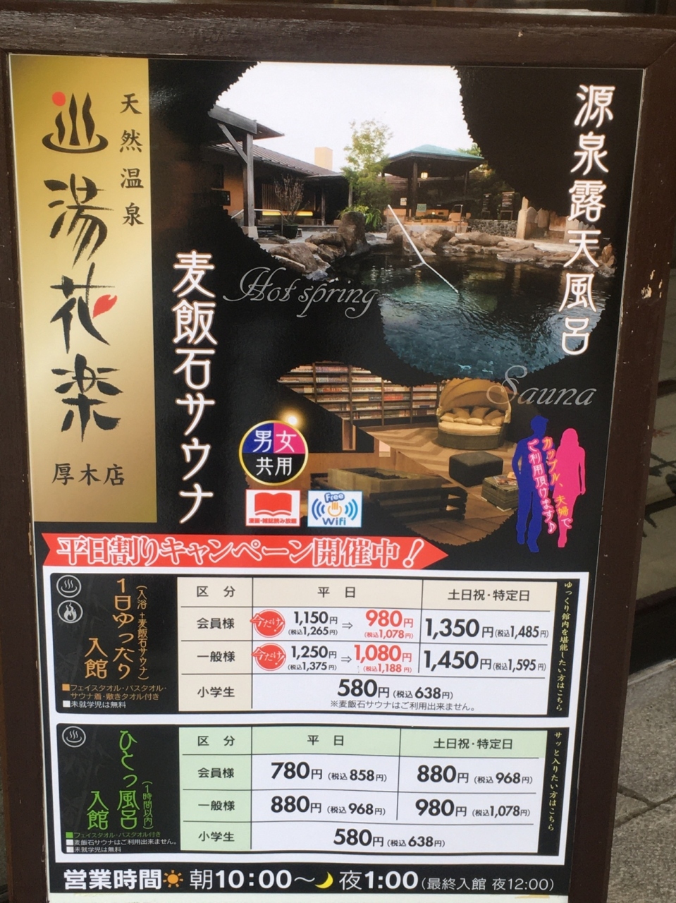小田急本厚木駅から神奈中バスで「穴口橋」下車、徒歩3分です。小鮎川そばの日帰り温泉で、大きな看板が出ています。日本庭園風の露天風呂、麦飯石サウナ、雑誌が読めるラウンジ、レストランなど利用でき一日のんびりと休養できます。平日がお勧めで、手ぶらで1000円ほどの料金でリフレッシュできます。本厚木駅から無料送迎バスも出ています。