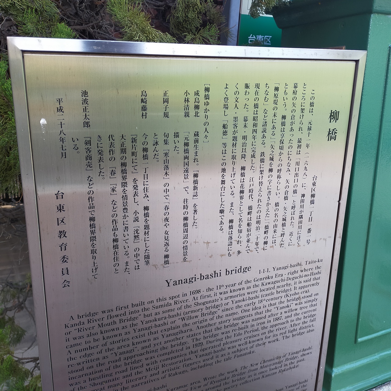 散歩の途中で見つけた柳橋の説明です。柳橋は神田川にかかる橋の中で、一番の下流にあり、隅田川に繋がっています。このエリアも柳橋と呼ばれていて、古くは料亭と柳橋芸者で有名でした。近くには、江戸前の天ぷら屋さん、佃煮屋さんなどがあります。
