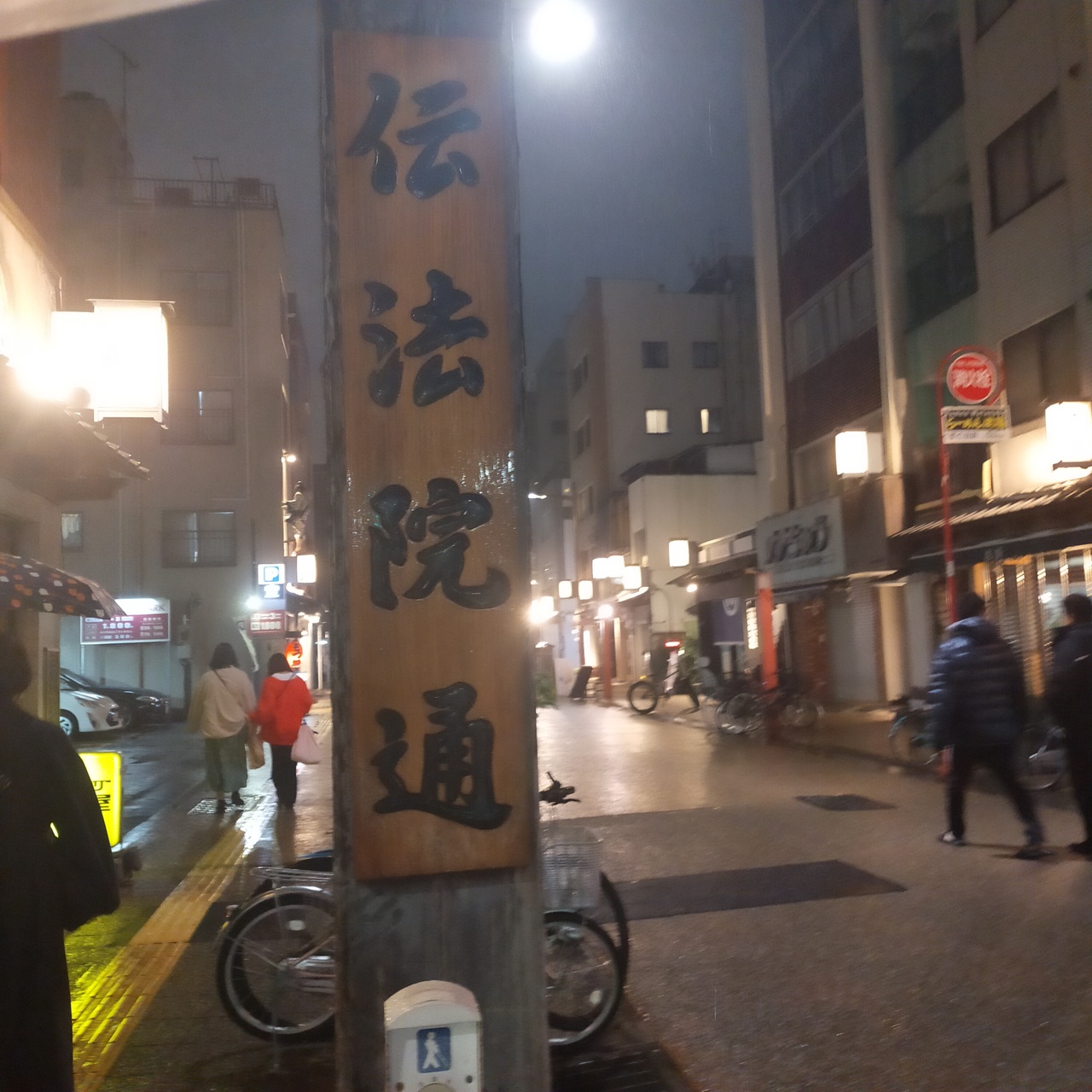 浅草の浅草寺と雷門をつなぐ通りを横切る通りです。レトロな街灯が浅草らしい雰囲気を出していて、夜が素敵です。飲食店が多いですが、お土産屋さんもあります。伝法院自体には行ったことがないので、次回は行って見たいと思います。