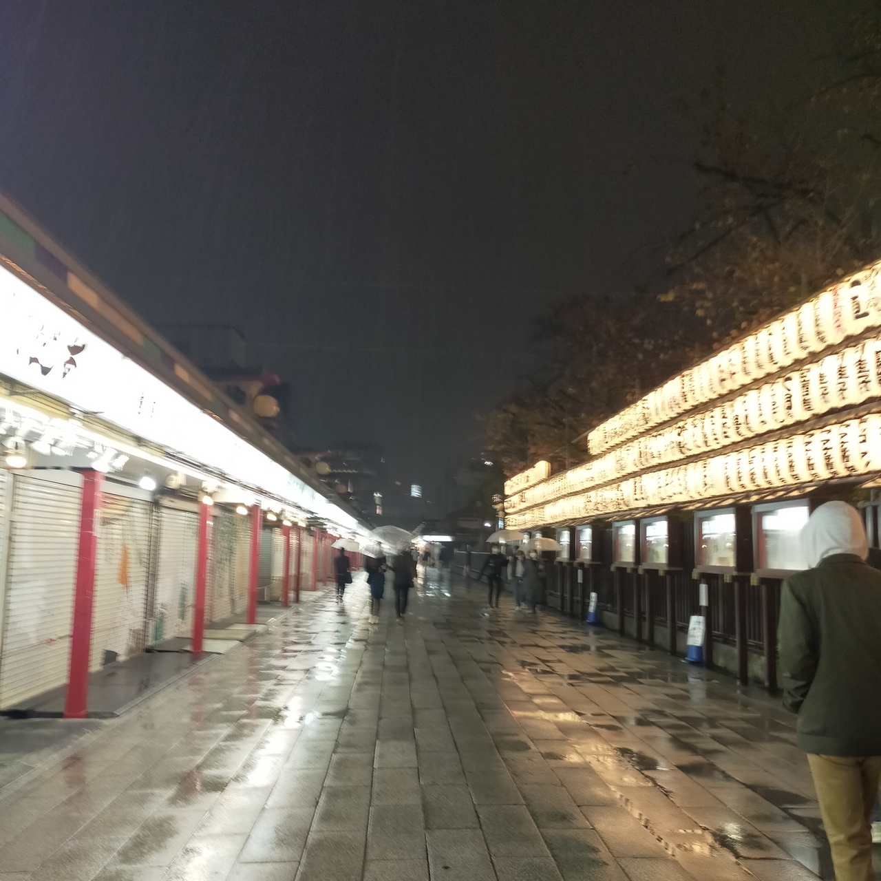 浅草観光の際にいってきました。雷門から浅草寺までの通りで、通りの両サイドにはお店がならんでいます。夜だったので、開いていないお店が多かったですが、雷おこしやさんなどは開いていて、浅草らしさを感じました。