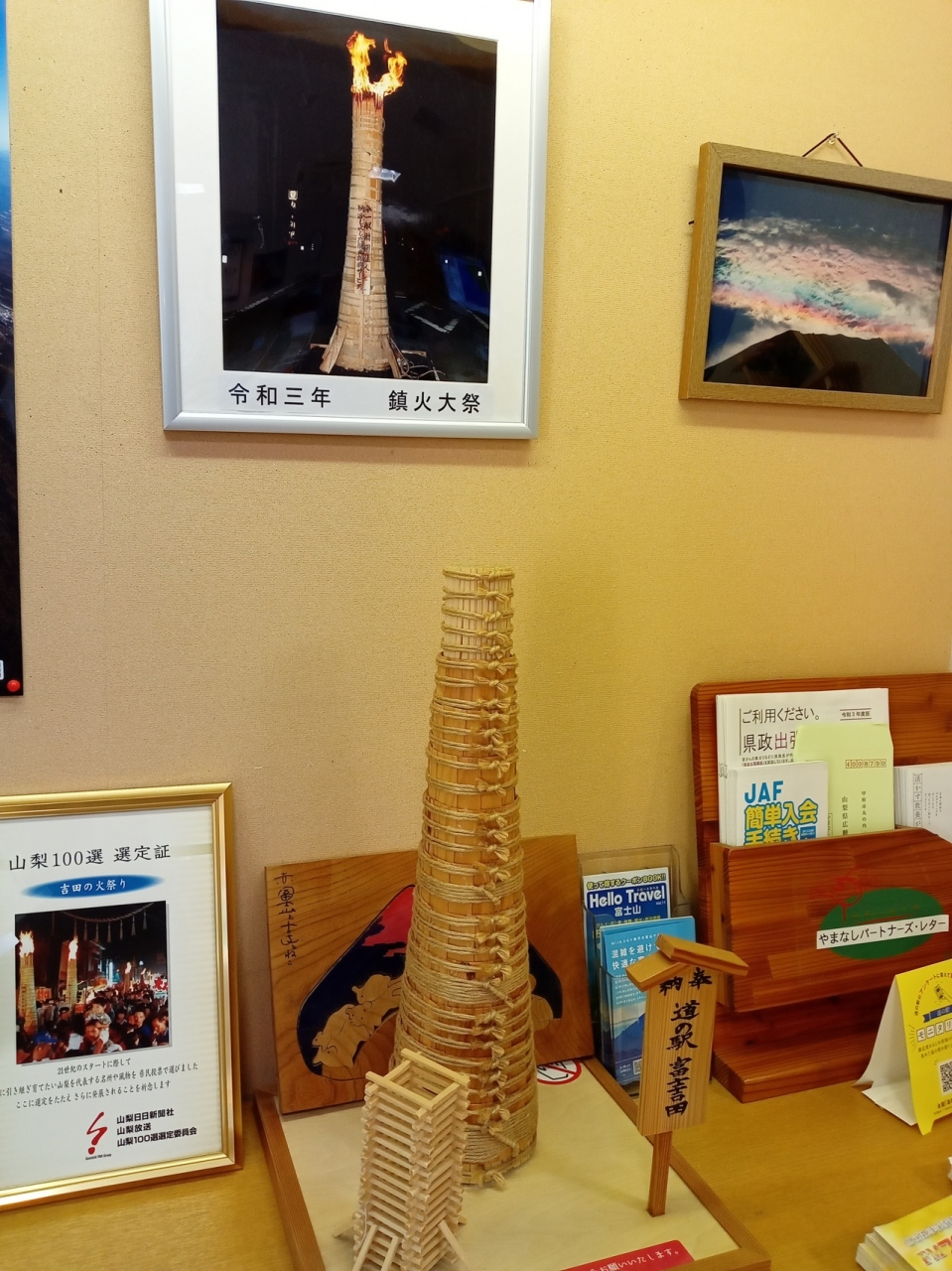 山梨県 富士吉田にある「道の駅 富士吉田」には、富士吉田の特産品やお土産商品を販売している物産館のほかに、観光案内所もあり、パンフレットなども用意されています。「吉田の火祭り」の模型もあり、一度見てみたい祭りです。