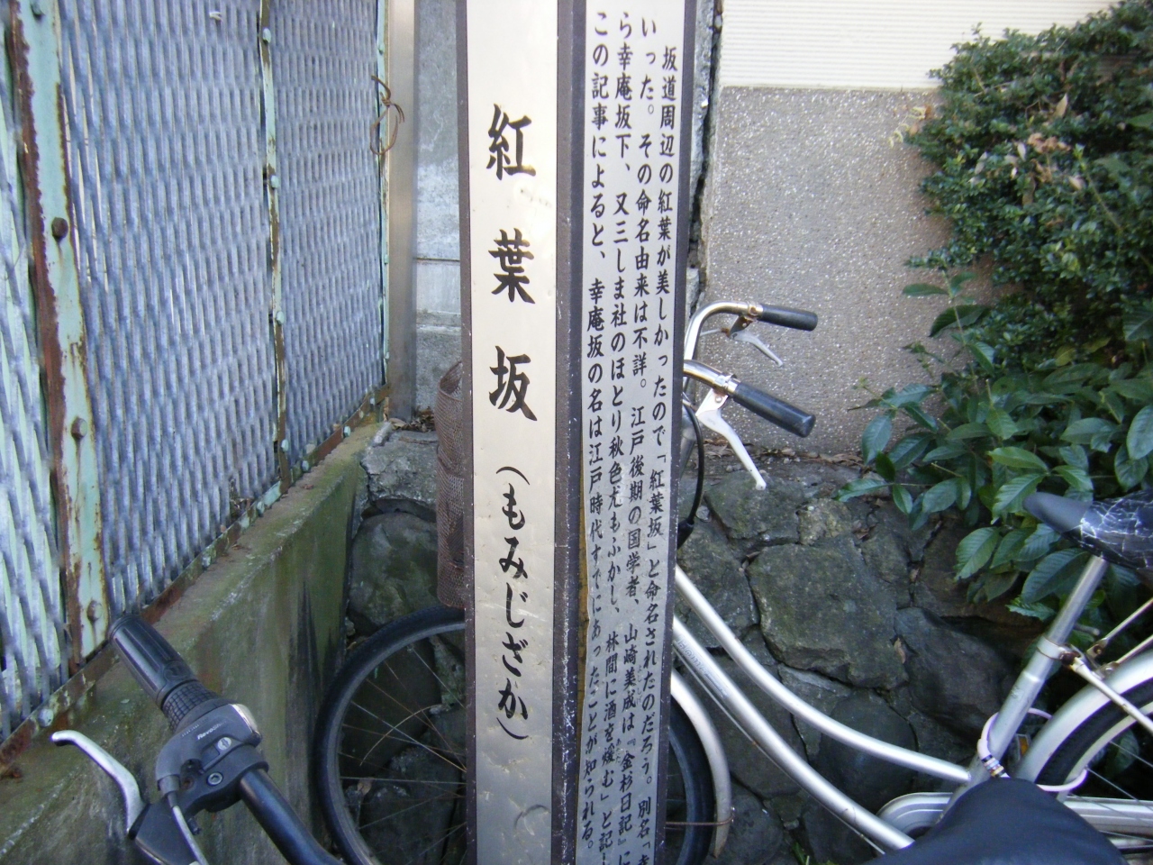 2020年12月に日暮里~谷中周辺を散策した際に立ち寄りました。JR日暮里駅南口改札を出て谷中霊園方面に進むとすぐの場所にある坂道です。階段とスロープが一体となった形の坂道ですね。坂の上に説明の柱が立っており、このあたりの紅葉が美しかったことから「紅葉阪」と名付けられたのだろう、と書かれていました。坂を登るとすぐに谷中霊園にたどり着きます。特にこれと言って特徴があるわけではありませんが、谷中霊園方面に行くには便利な通り道ですね。