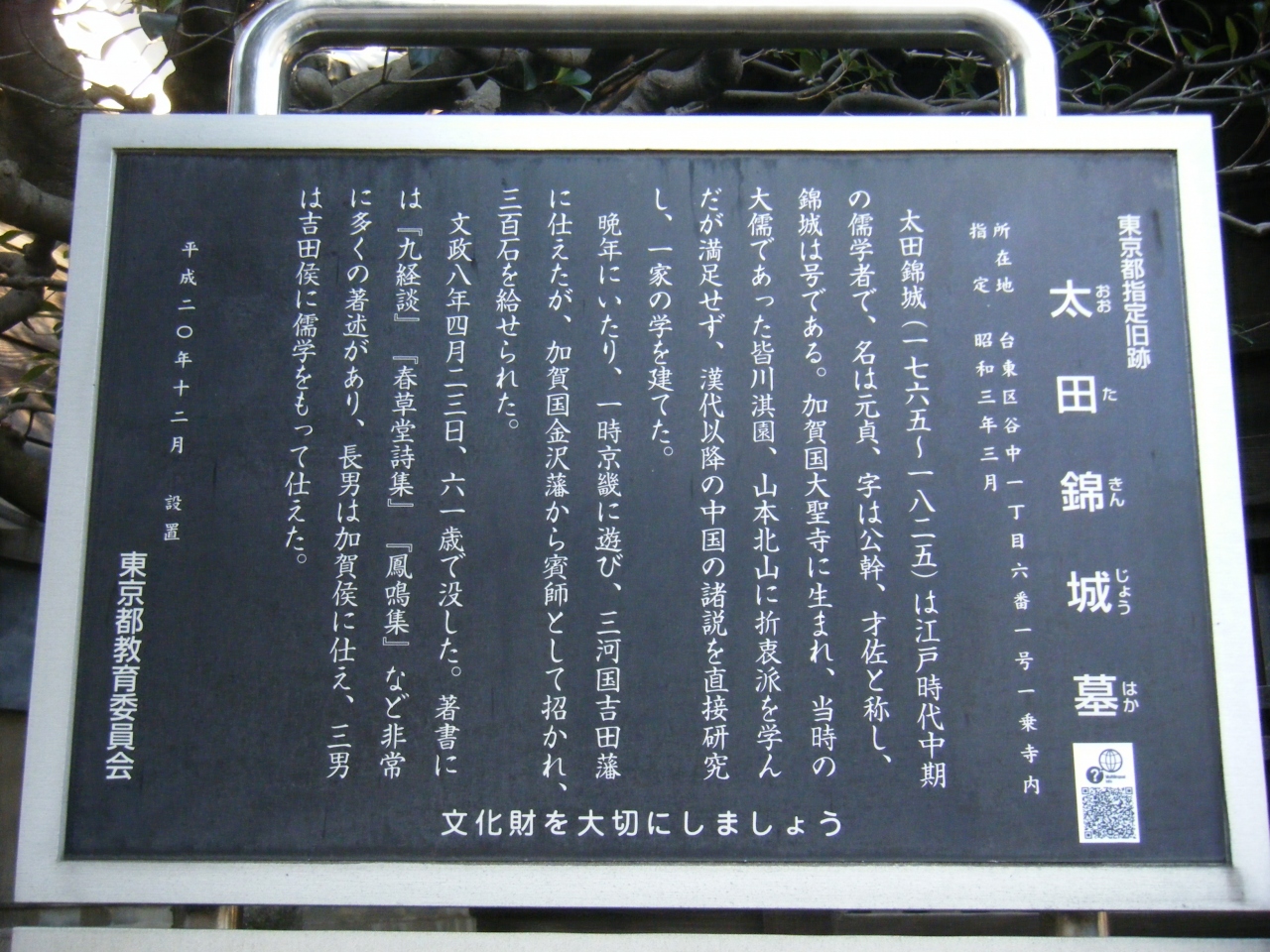 2020年12月に日暮里~谷中周辺を散策した際に立ち寄った一乗寺という谷中6丁目交差点そばにある日蓮宗の寺院に大田錦城の墓はあります。大変立派な山門のすぐ手前にその案内板が立っており、詳細が書かれていました。大田錦城とは初めて目にした名前ですが、江戸時代中期に活躍した儒学者とのことです。歴史は好きなのですが、儒学者に関しては知識が乏しく、よい勉強の機会に恵まれました。