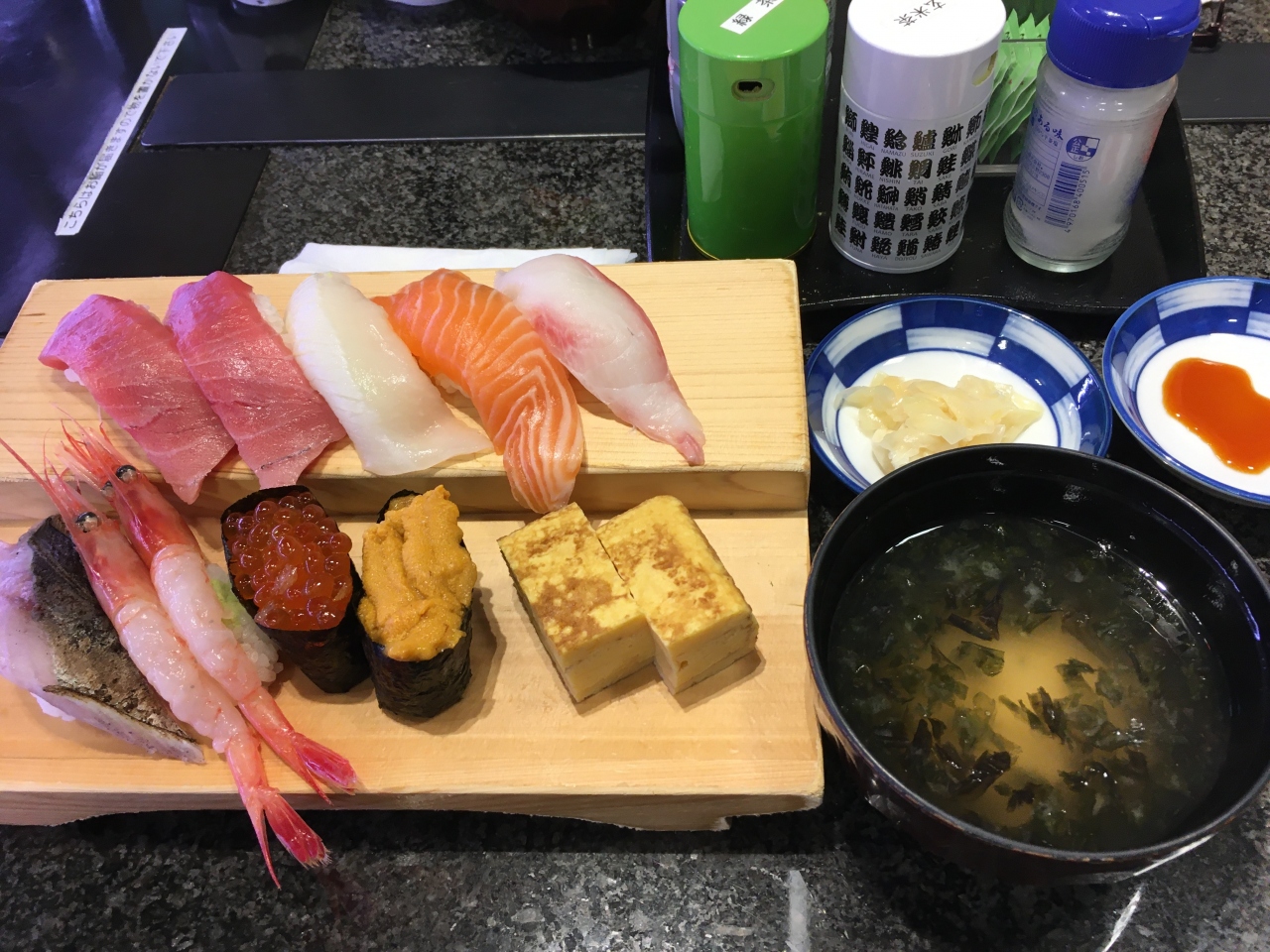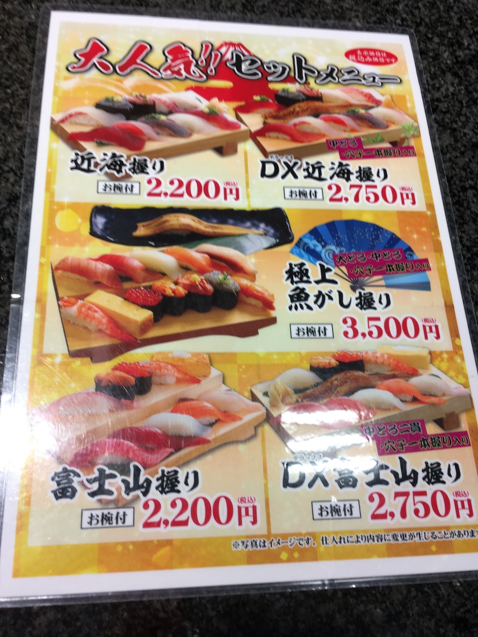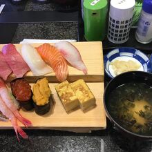 メニューにはいろいろあるものの、面倒になって友達も一緒に「DX富士山握り」という盛り合わせにしました。 1本アナゴ鮨とお椀がついていて、2750円でした。 どのお寿司も美味くて、ボリュームもちょうどいい感じで、大満足でした。