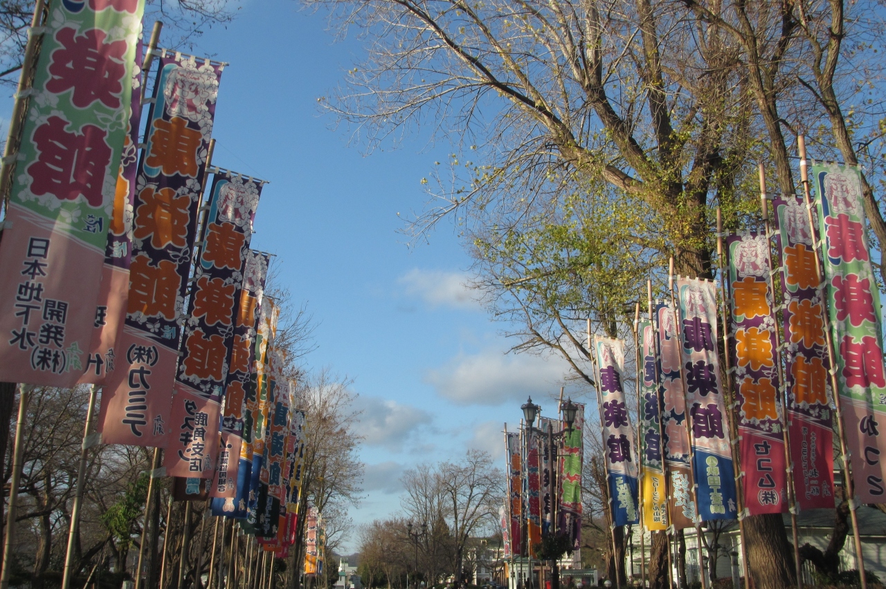 小坂鉱山事務所の手前に突如現れる数々ののぼり