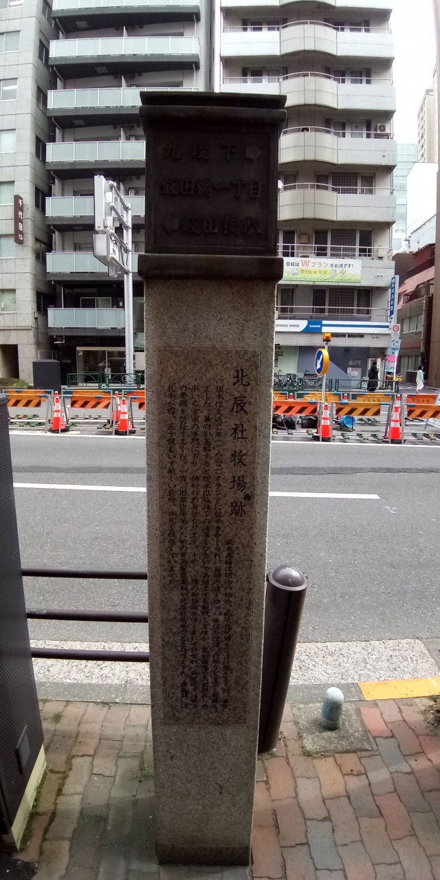 北辰社牧場跡碑の立派な石碑が、飯田橋駅周辺にあって、このエリアが歴史的にもたいへん重要であることをしみじみ感じました。主要道路の歩道にこの碑が堂々と立っているので見つけやすく、見逃せない観光アトラクションだと思います。