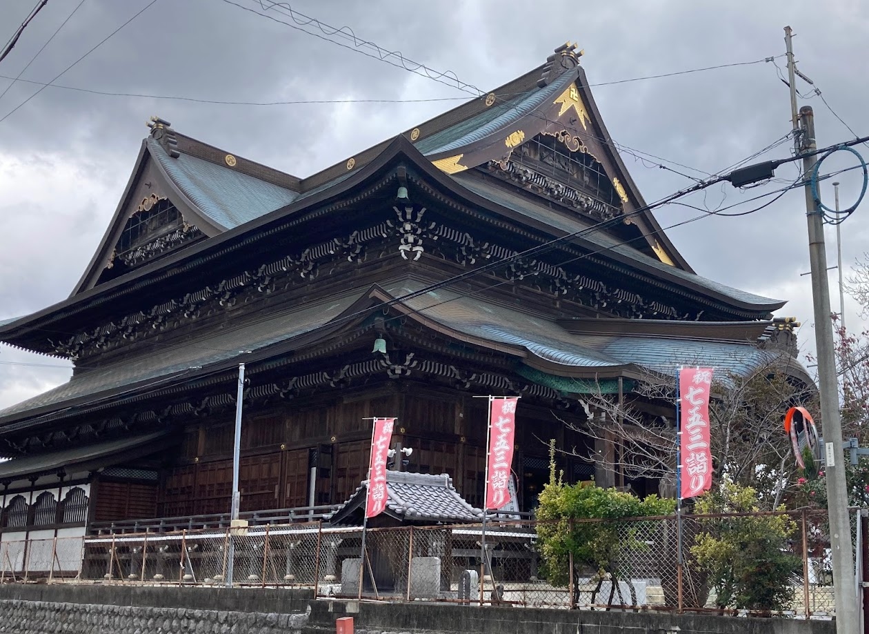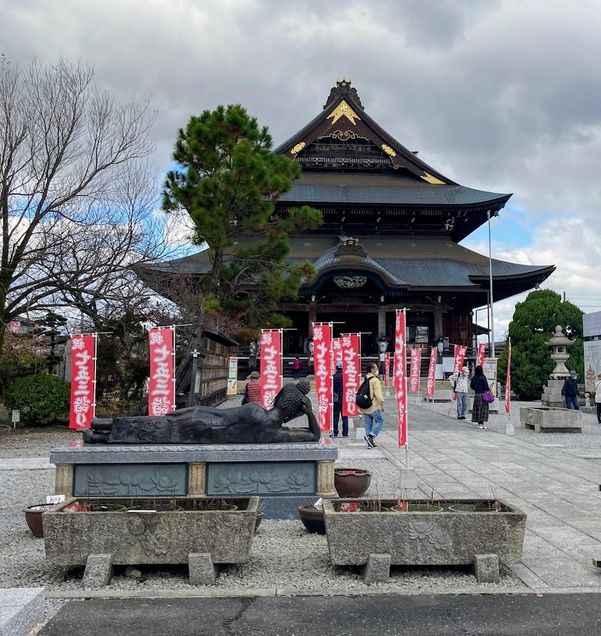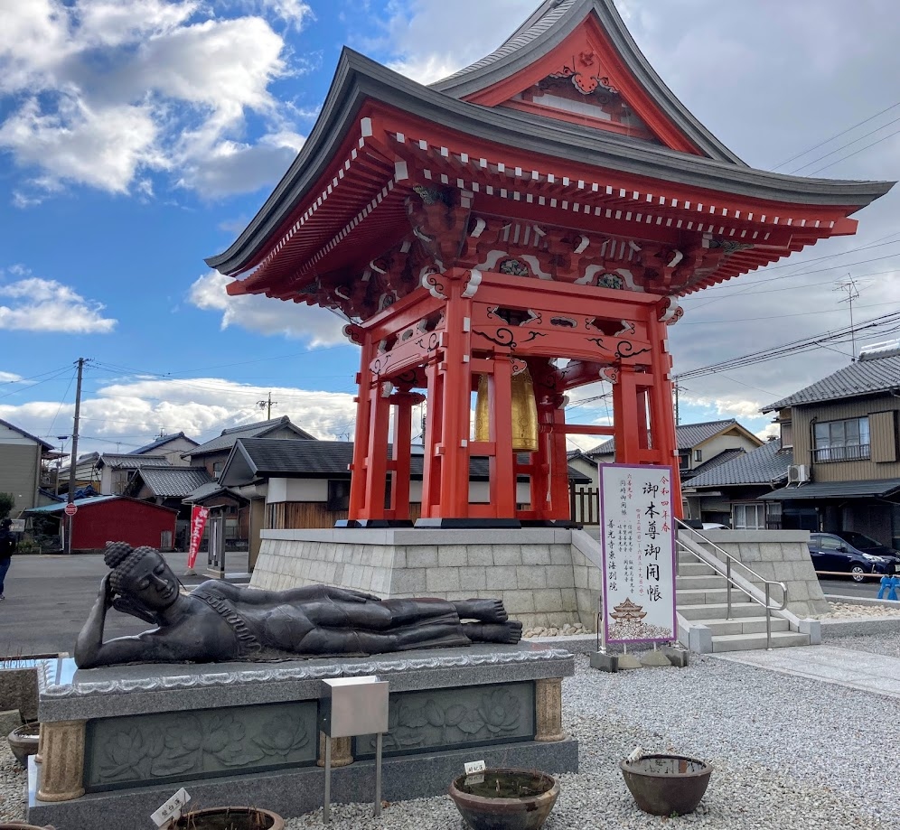 本堂正面には、お参りするとポックリ逝けるご利益があるといわれる寝釈迦がいらっしゃり、そのお隣には、新しくできたばかりの鮮やかな朱色の鐘楼の中に、金色の鐘が光り、存在感がありました。