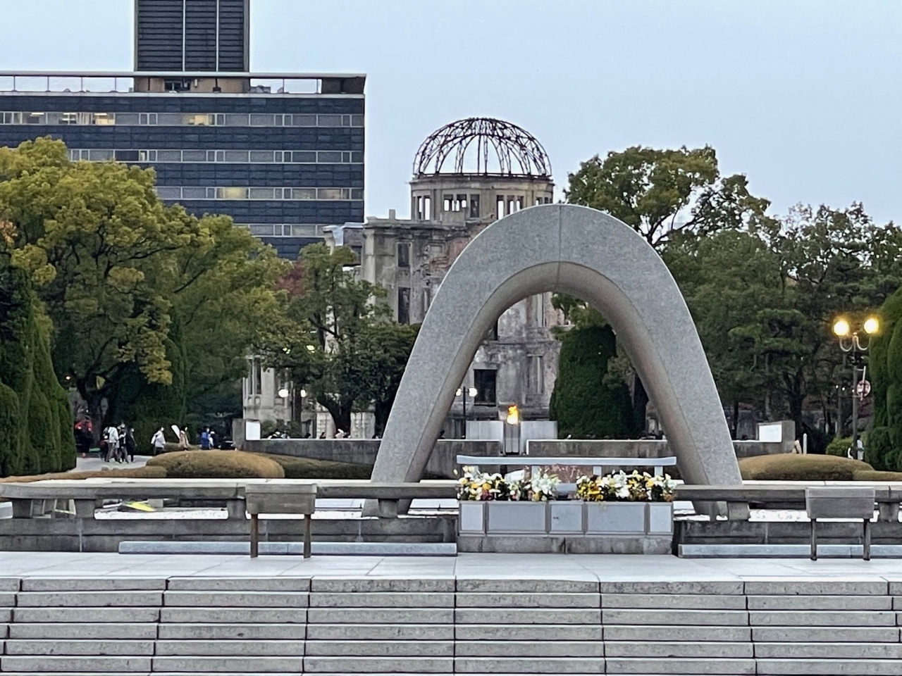 中へ入ることなどはできません。柵から先へは入れません。夜もライトアップされていて、昼間とはちょっと違う雰囲気で見学できます。広い公園となっています。散策しながら合わせて資料館を見てください。