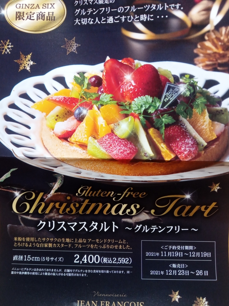 「GINZA SIX店限定 クリスマスタルト(グルテンフリーフルーツタルト)」だそうで、予約を受け付けているそうです。グルテンフリーのケーキはなかなかとないので、お探しの方に良いかも知れません。