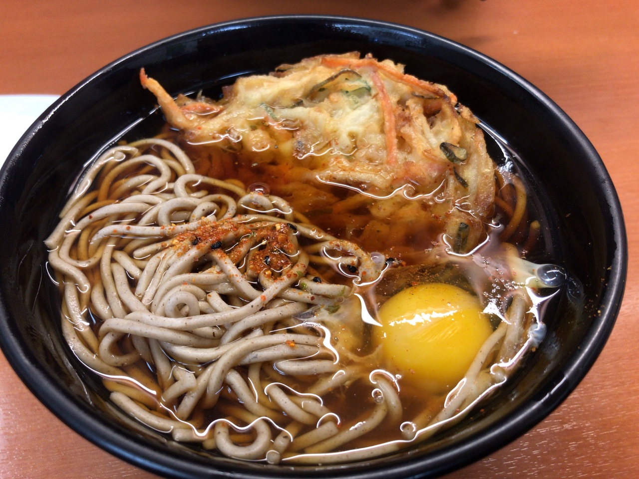 かき揚げそばに卵をトッピングしましたが、他のJR東日本の駅そば店と変わりない感じでした。