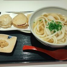 水天宮前にあるうどん屋さんです。 カウンターと奥にテーブルあり。 テーブル希望、と言ったら快く応じてくださいました。 天ぷらの単品と、かけうどんをオーダー。うどんの量は追加ナシで大盛を選ぶことができます。トッピングも豊富なので、何度行っても飽きないお店です。