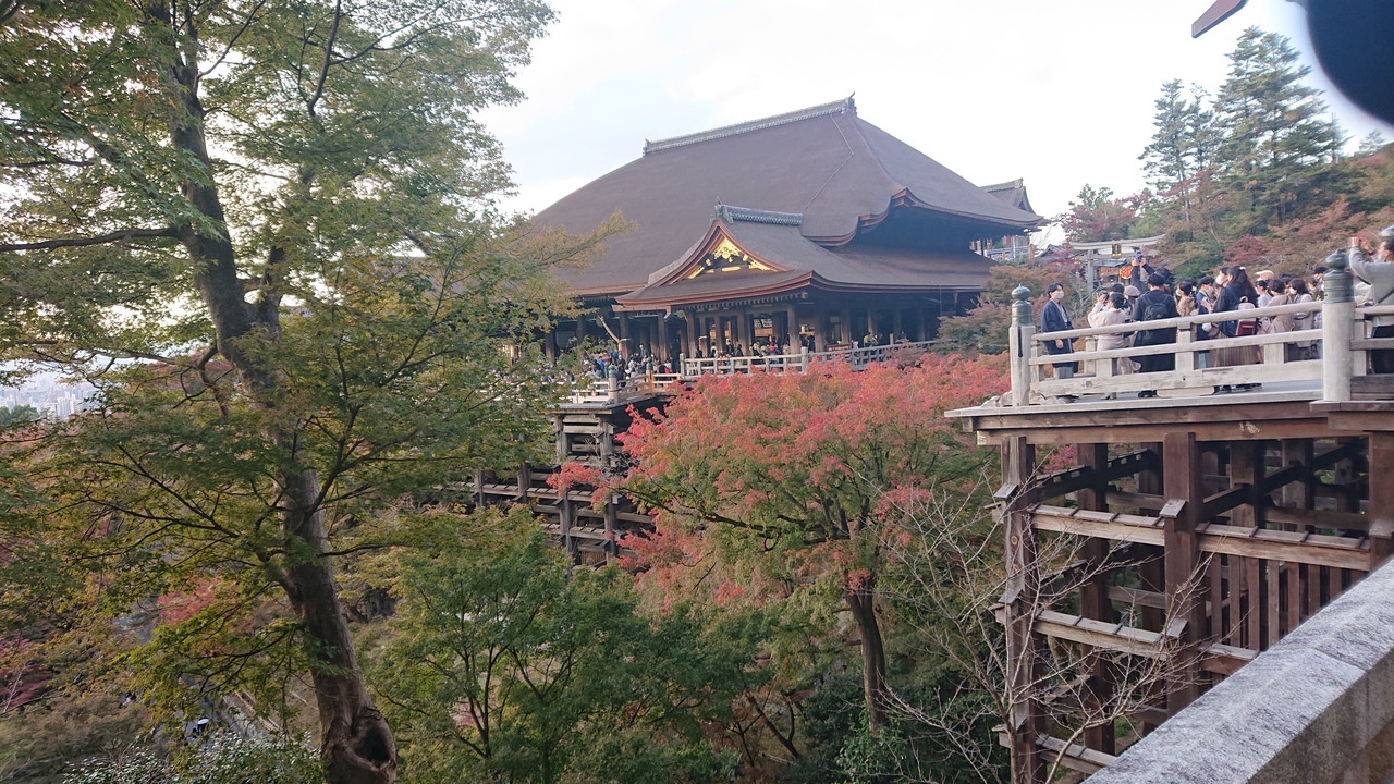 11月14日、10年振りに来ました。紅葉もそこそこ有ります。レンタル着物姿の日本人女性、外国人女性がたくさんいます。やはり清水寺です。京都を代表する場所です。下り坂に左右に沢山のお土産屋さんがあり、試食したり、眺めたり、マスクはしておりますが、久々の旅行気分が味わえました。17時を過ぎ、京都駅迄路線バスで帰ります。五条坂のバス停は、臨時に閉鎖され、一つ隣の清水道迄歩かせられました。道路もかなり渋滞しており、バスが来ても満員で少ししか乗れません。夕方は、時間の余裕を持ってスケジュールを組むことをお薦めします。
