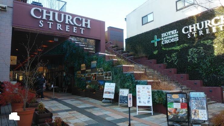 旧軽井沢銀座商店街と聖パウロカトリック教会の間に建つショッピングモール。数多くのテナントが入居していた。