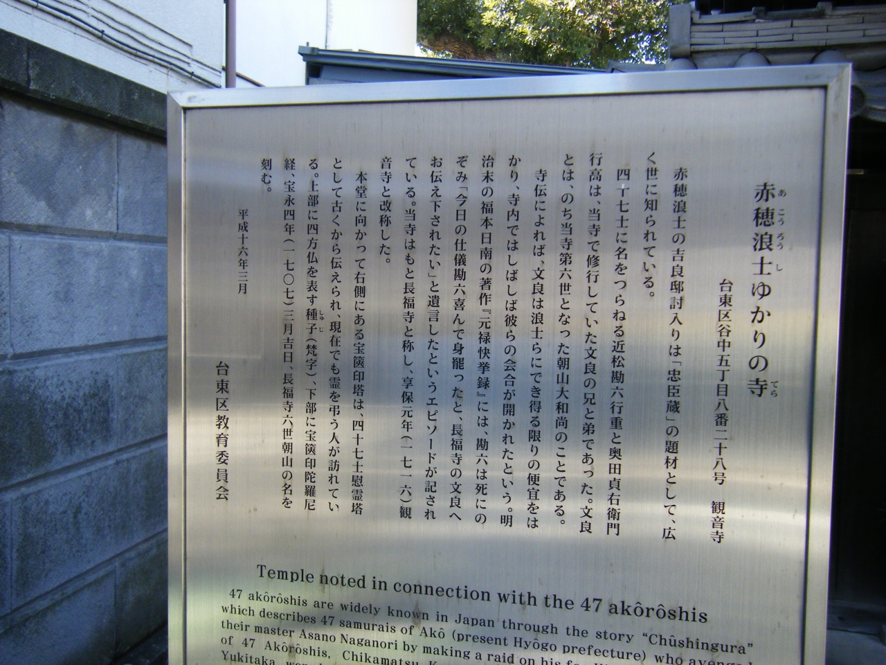 2020年12月に日暮里~谷中周辺を散策した際に立ち寄りました。谷中霊園の西側、朝倉彫塑館のある通り沿いにある新義真言宗の寺院になります。今から400年ほど昔の慶長年間(1596年~1615年)に神田北寺町にて創建され、その後延宝8年(1680年)に現在の場所に移転したそうです。創建当初は「長福寺」という名前だったそうですが、享保元年(1716年)に現在の観音寺に名前を改めたそうです。観音寺は赤穂浪士の討ち入りと関係がある寺院だそうで、寺院の前に説明の案内板が立っていました。なんでも赤穂浪士のメンバー2名の兄弟が、こちらで和尚をされていたとのことで、赤穂浪士の会合にも使用された寺院とのことです。歴史を感じさせる山門と、立派な本堂が印象に残る寺院でした。