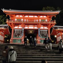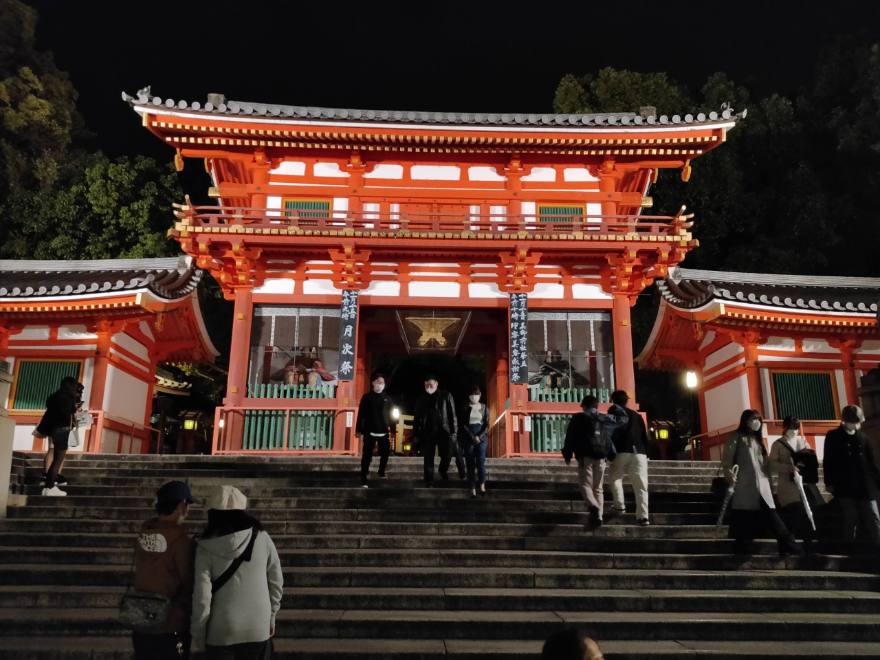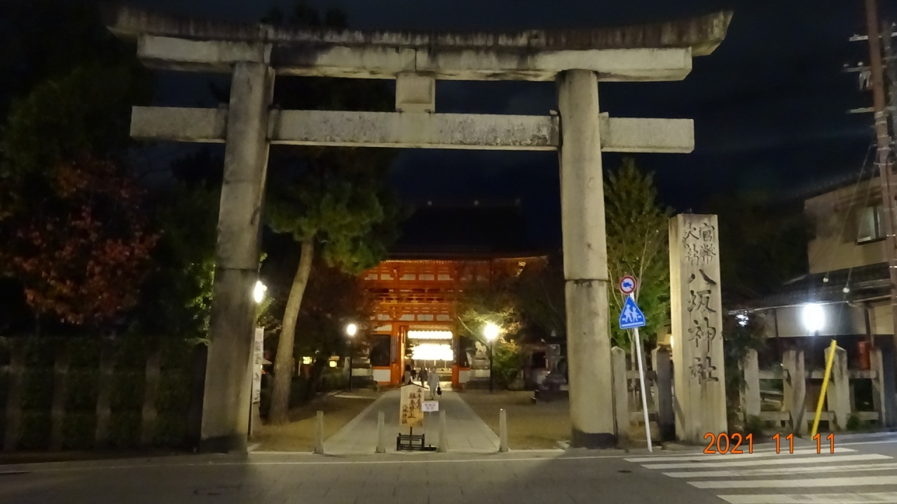 祇園四条駅から四条通り、商店街を歩いて行くと遠くに八坂神社の明るい西楼門が見えて来ます。