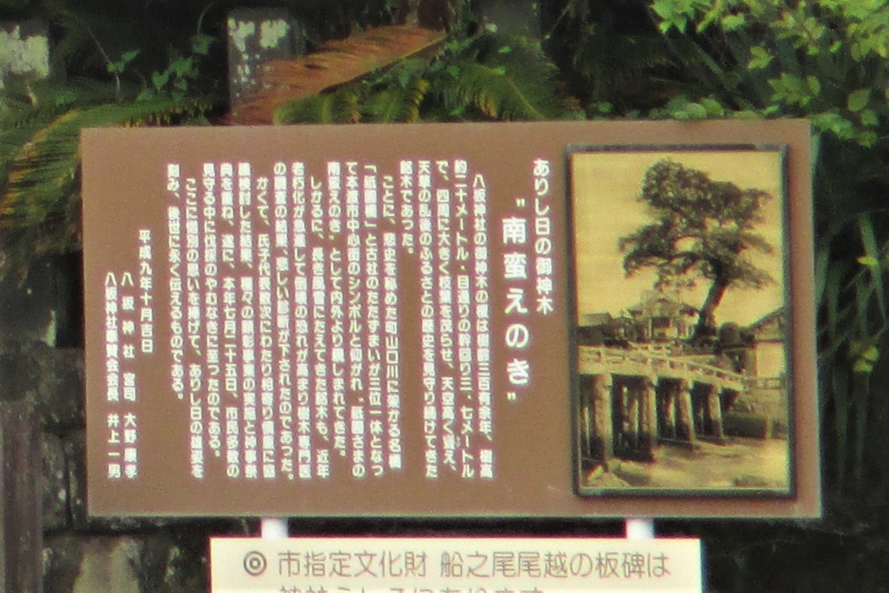 鳥居の前に写真と説明書きがありました。そこには周囲を見下ろす様な大きな木が写っていました。八坂神社祇園社のご神木「南蛮えのき」とのことです。樹齢は300年以上、高さは20mもあり、目通りの幹廻りは3.7mだったそうです。地元では「祇園さまの南蛮えのき」として親しまれていたそうですが、1997年(平成9年)に樹命が尽きたということです。