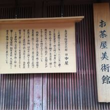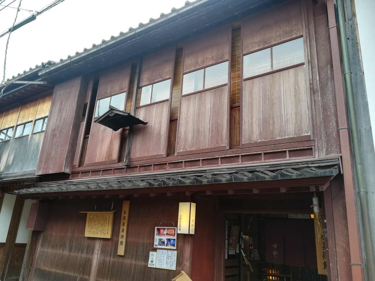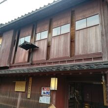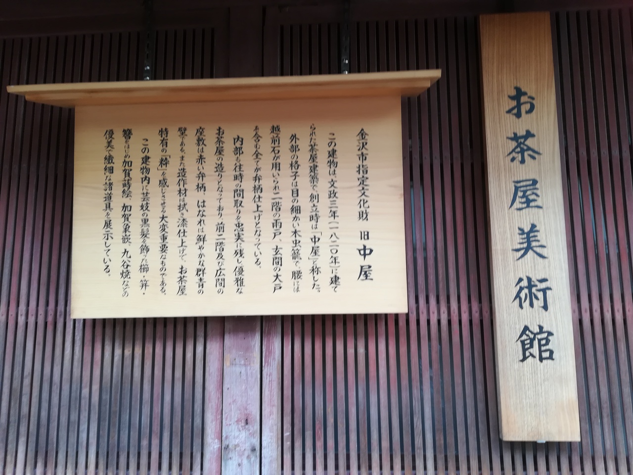 金沢のひがし茶屋街にある、伝統的な雰囲気と調和しています。1820年建築の木造建造物で、お茶屋美術館の案内板がありました。