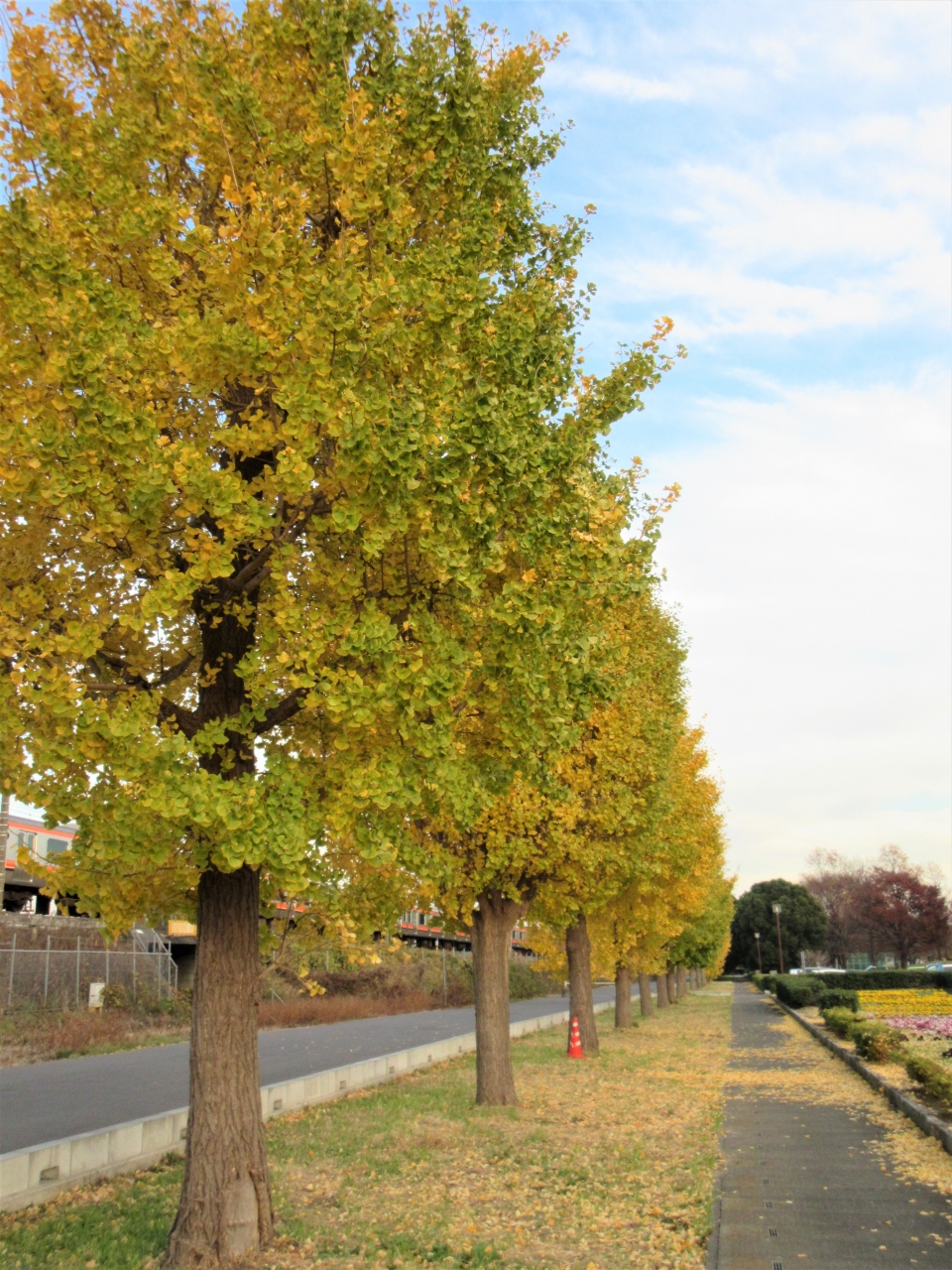 イチョウ並木の横では、パンジーで色分けした大きな『花文字』が書かれていました。少し高台を走る武蔵野線からでないと、読めないかもしれません。